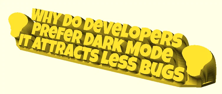 Bạn đang tìm kiếm một món phụ kiện trang trí độc đáo cho góc máy tính của mình? Hãy thử ngay mẫu thiết kế 3D in thông điệp hài hước dành riêng cho dân lập trình với nội dung "Why Do Developers Prefer Dark Mode? It Attracts Less Bugs". Đây là một phụ kiện để bàn nhỏ gọn, dễ in và mang đậm tính giải trí cho môi trường làm việc văn phòng. Với thiết kế dạng chữ nổi hiện đại, mô hình này không chỉ làm đẹp bàn làm việc mà còn là cách để bạn thể hiện cá tính riêng của một kỹ sư phần mềm. Bạn có thể dễ dàng in bằng máy in 3D với nhựa PLA thông thường mà không cần tốn nhiều công đoạn hậu kỳ hay support cầu kỳ. Đây chắc chắn là món quà tuyệt vời dành tặng cho chính bạn hoặc các chiến hữu coder thân thiết.