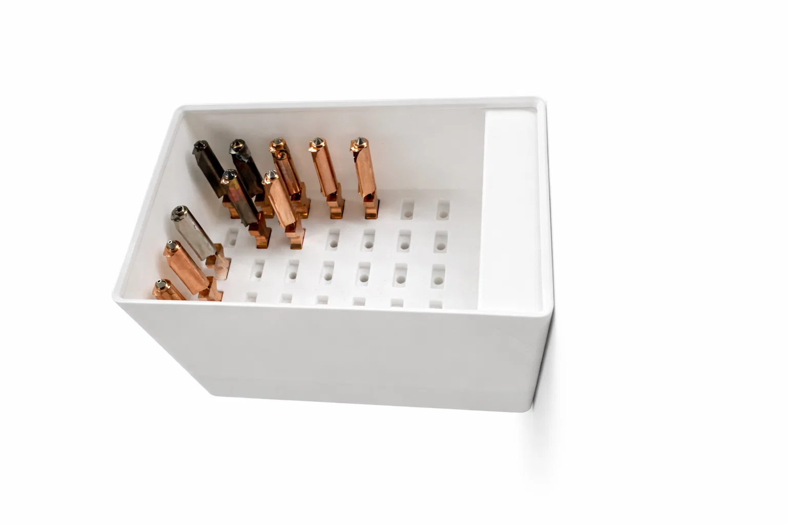 Nếu bạn đang vận hành nhiều máy hoặc thường xuyên thay đổi đầu in, việc để nozzle lộn xộn sẽ rất khó quản lý. Khay này giúp bạn: