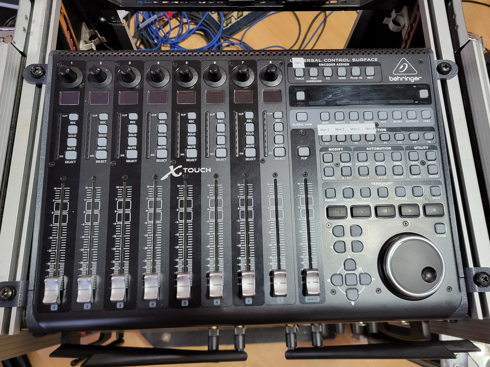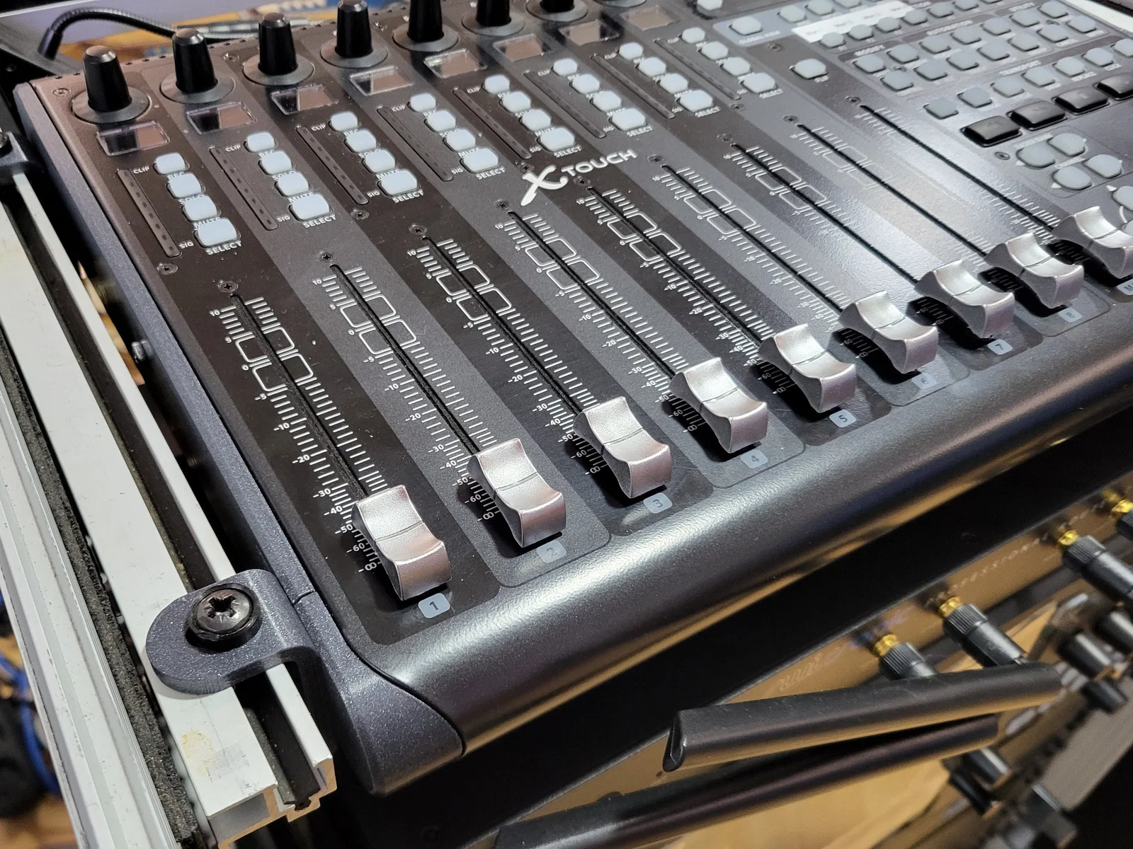 Hai ốp bên gốc của Behringer X-Touch quá rộng để đặt vừa tủ rack tiêu chuẩn 19" với kích thước trong là 450mm, và chúng cũng không có cách nào để bắt vít cố định lên thanh ray.