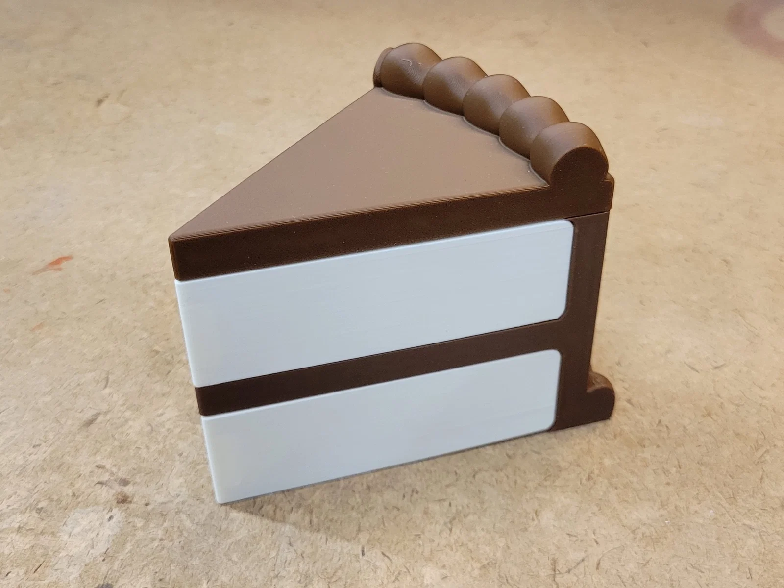 Chào mọi người! Đây là mẫu hộp đựng có hình dáng một miếng bánh ngọt mà mình đã thiết kế với mục tiêu giúp cho việc in và lắp ráp trở nên dễ dàng nhất có thể. Mẫu này có hai phiên bản: một bản với các chi tiết trang trí được gắn liền vào phần thân và nắp hộp, và một bản có các chi tiết trang trí được in riêng để bạn thoải mái phối màu. Với cả hai phiên bản, chỉ có phần nắp là cần một chút support. Mình khuyến khích các bạn nên dùng thêm brim khi in phần trang trí trên nắp để tránh việc nó bị đổ giữa chừng. Ngoài ra, tùy vào độ bám dính của máy in, bạn cũng có thể cần dùng thêm brim cho các miếng 'Top Layer' và 'Bottom Layer' để tránh bị bong góc khi đang in.