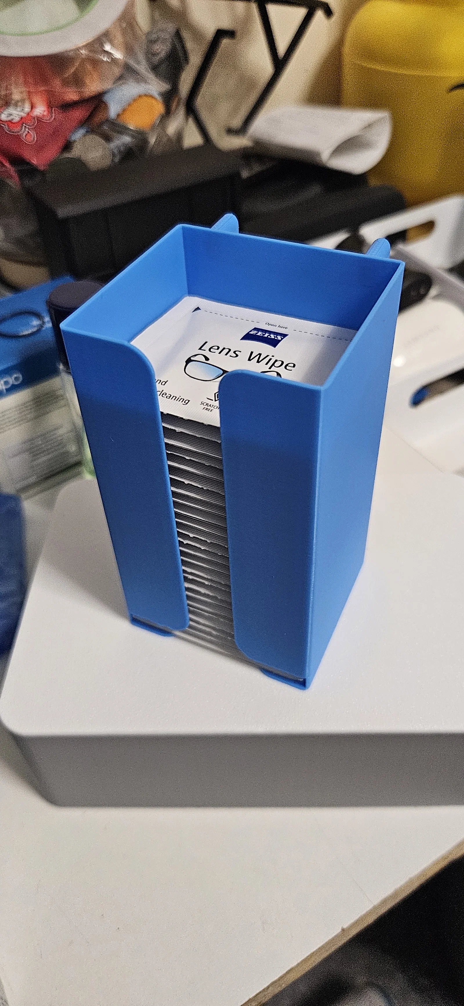 Sản phẩm này cực kỳ tiện lợi cho những ai thường xuyên vệ sinh kính mắt, màn hình điện thoại hoặc ống kính máy ảnh. Thiết kế của khay giúp các gói khăn lau được xếp chồng ngay ngắn, và phần khe hở ở mặt trước cho phép bạn rút từng gói một cách dễ dàng mà không làm rơi cả xấp. Đây là một món phụ kiện in 3D nhỏ gọn nhưng cực kỳ hữu ích, giúp tối ưu hóa không gian làm việc và giữ cho góc làm việc luôn ngăn nắp.