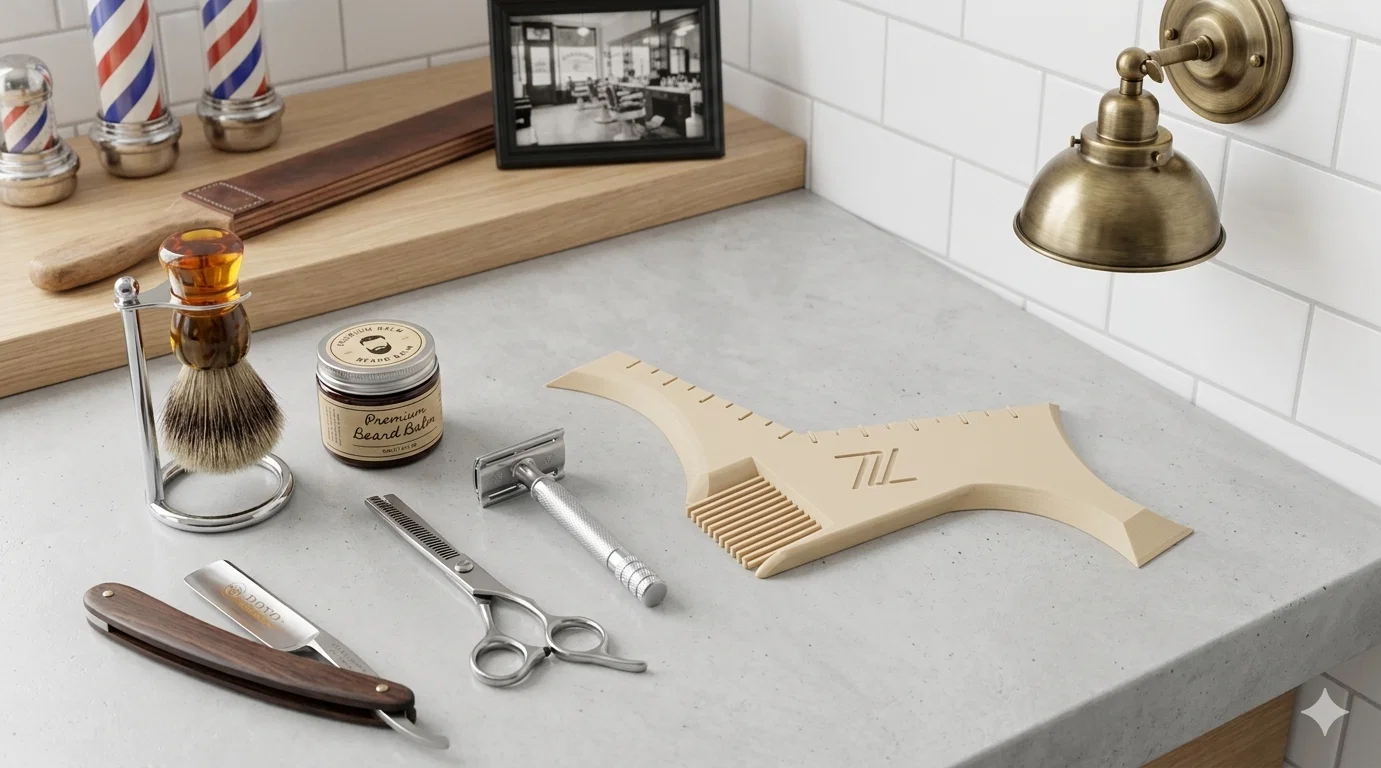 Bộ dụng cụ tạo kiểu râu chuyên nghiệp giúp anh em dễ dàng căn chỉnh đường cạo đối xứng cho má, hàm và cổ. Thiết kế tích hợp lược chải tiện lợi, hỗ trợ cạo tỉa chính xác bằng dao hoặc tông đơ với độ hoàn thiện cực tốt khi in 3D.