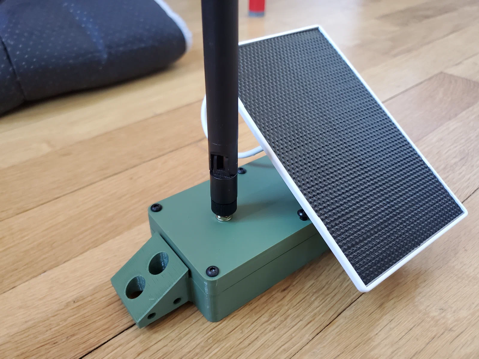 - Hình ảnh pin đã cắm điện, dây nguồn năng lượng mặt trời dẫn ra ngoài. Anten cũng đã được kết nối và cố định vào mặt dưới của nắp.