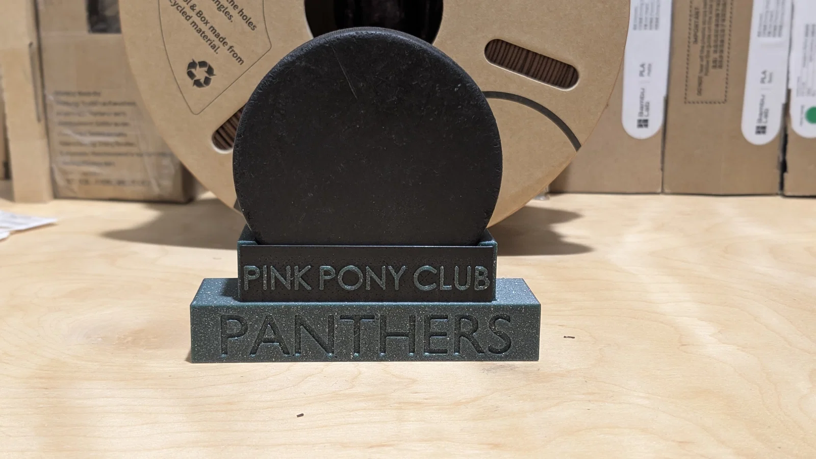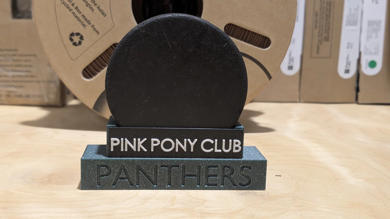 Bản remix từ đế trưng bày của Steeve, thay đổi linh vật đội. GO PANTHERS! Có thể đặt vừa 14 đế đỡ puck trên bàn in 256mm. Phiên bản này còn có thêm bảng tên đi kèm. Các bảng tên được sắp xếp trên một tấm riêng để bạn có thể sao chép và in tùy ý. Phần chữ được thiết kế ngay trong phần mềm slicer nên bạn có thể chỉnh sửa nhanh chóng cho các giải thưởng của đội mình. Hãy đặt tên giải thưởng thật vui nhộn nhé. Ví dụ là "Pink Pony Club" vì dù thắng hay thua, luôn có những đứa trẻ cứ nhảy múa khi nhạc nổi lên! File Blender cũng được bao gồm với đối tượng tên và thiết lập boolean để bạn có thể tùy chỉnh cho đội của mình.