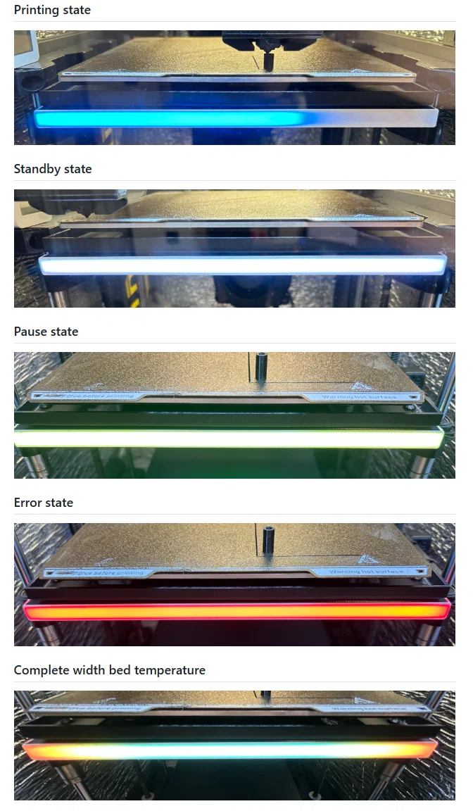 Thanh đèn LED trạng thái cho máy in 3D chạy Klipper, được lấy cảm hứng từ H2D. Nó giúp hiển thị trạng thái máy in, tiến độ in và nhiệt độ bàn nhiệt theo thời gian thực.