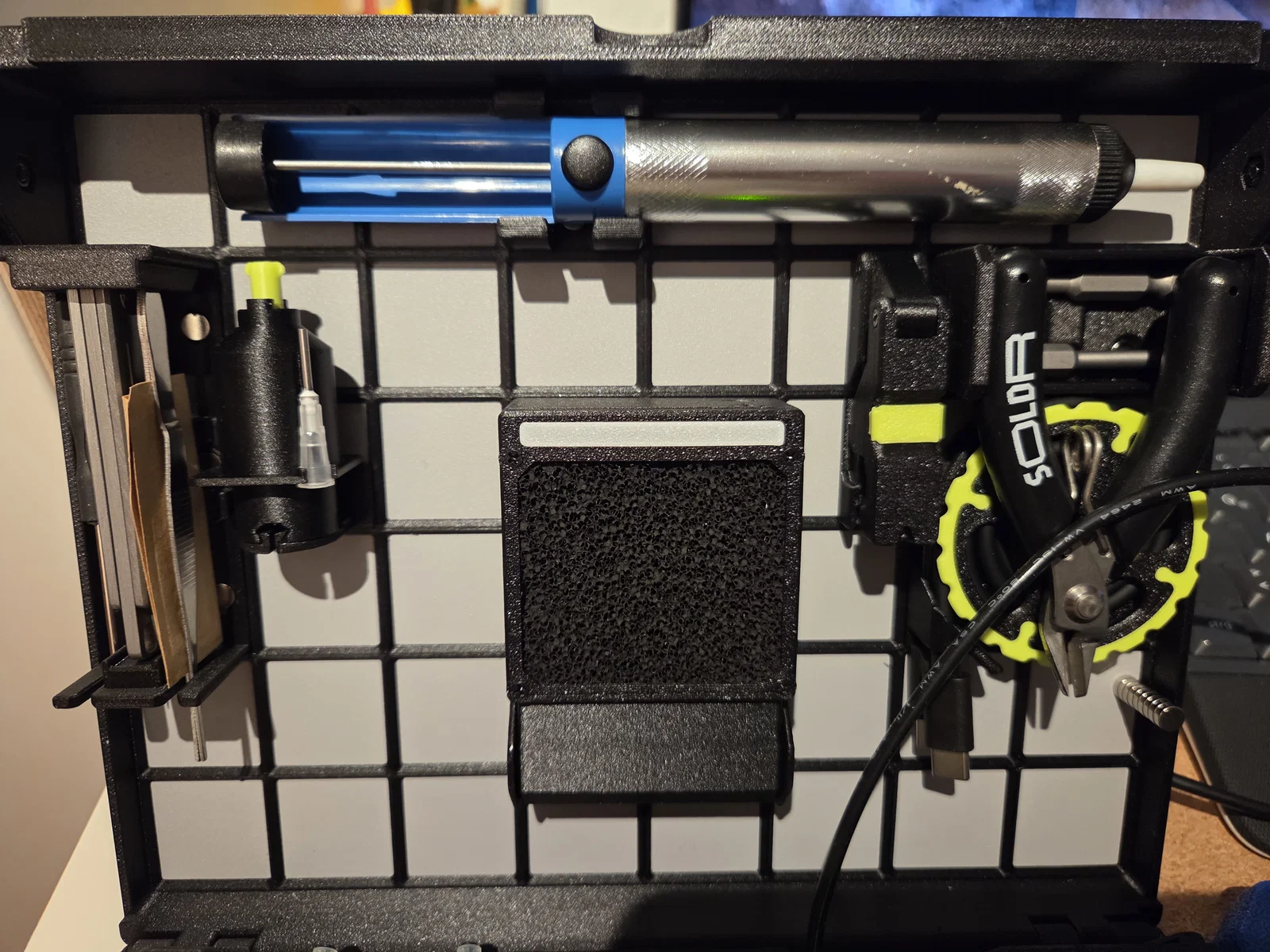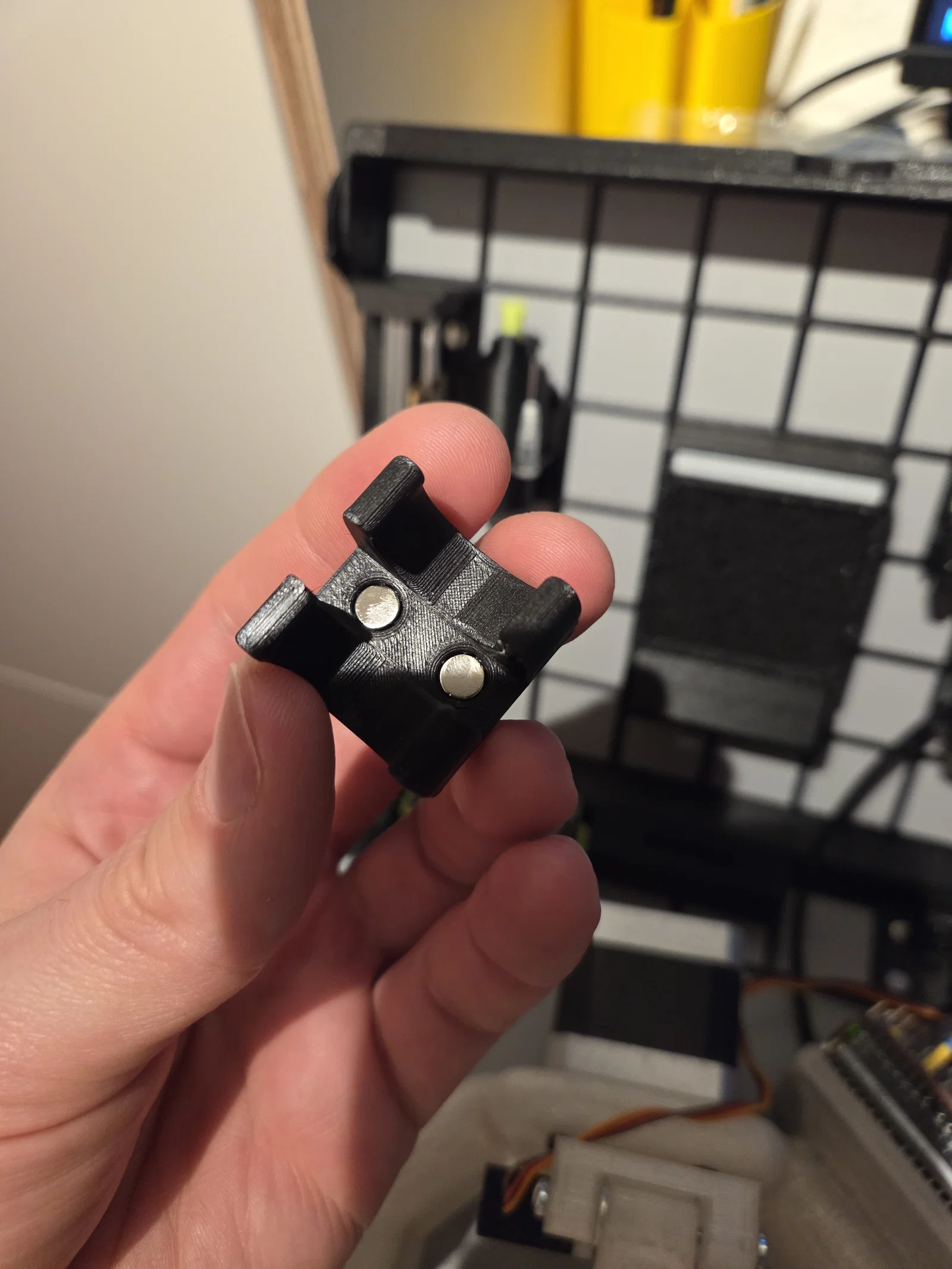 Mình thiết kế cái này cho cái hút chì (solder pump) mình đang dùng. (https://amzn.eu/d/0ecDHleE) Nó vừa khít và có thể gắn cố định ngay khi đang sử dụng. Thiết kế này tận dụng được nam châm đi kèm theo bộ (đường kính 6mm, cao 2mm).