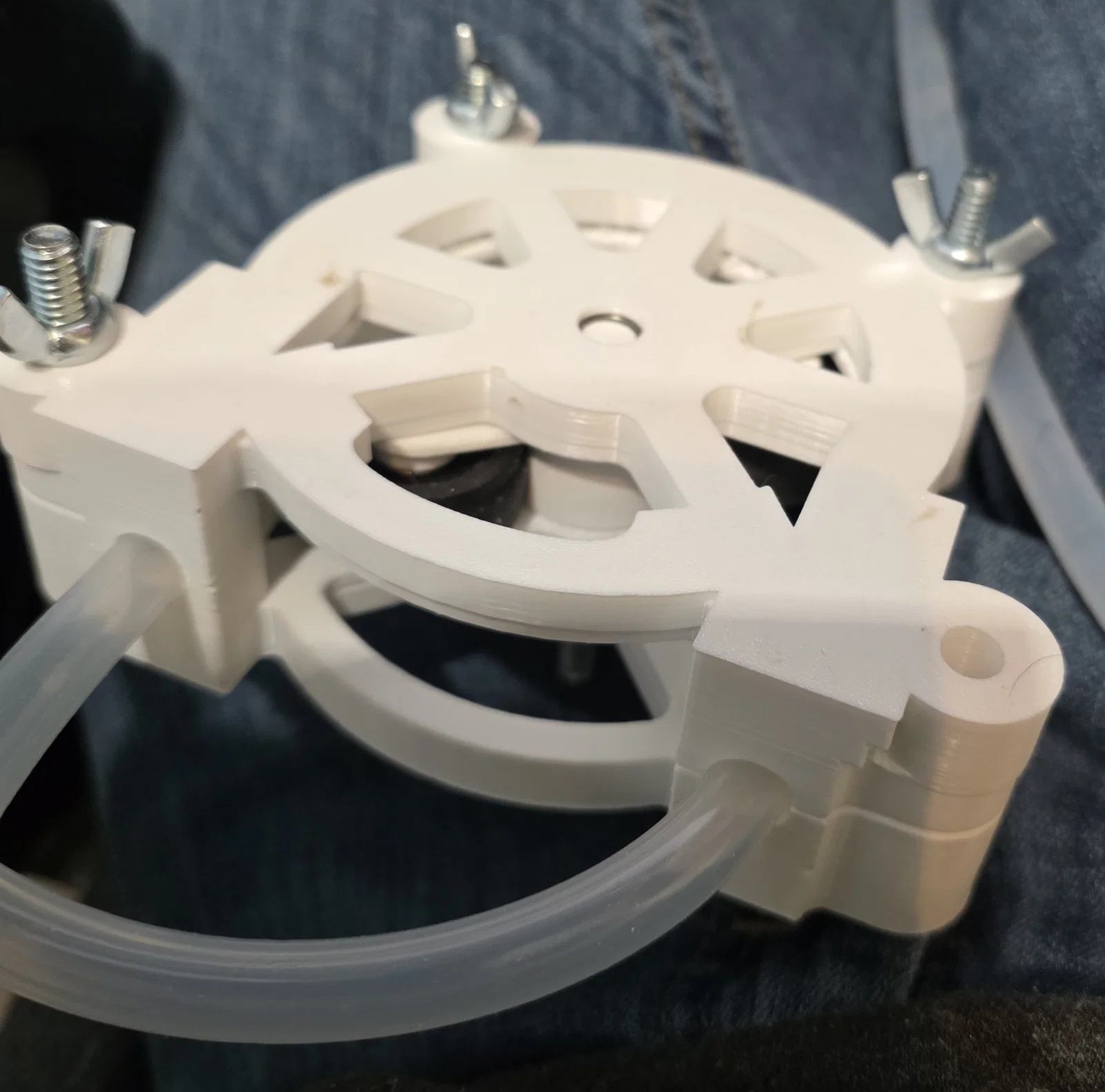 - Đặt ống silicone xung quanh cụm rotor, sau đó lắp phần trên của vỏ bơm vào. Hãy cẩn thận để không làm kẹp hay dập ống.