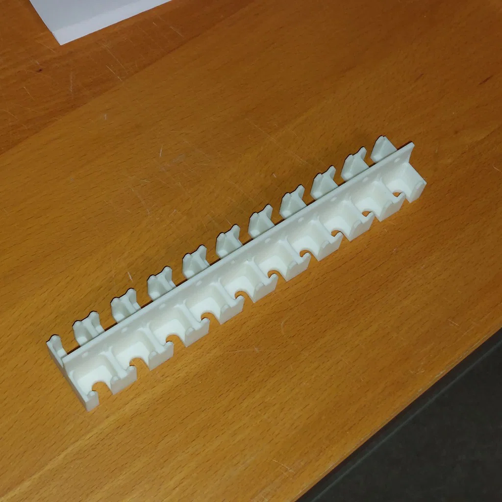 Thiết kế này dạng module (cho một sợi cáp) nên bạn có thể nhân bản tùy ý để phù hợp với nhu cầu. Chỉ cần trí tưởng tượng và cái bàn in của bạn là xong... Hãy dùng file RJ45 holder module.STEP để tự tạo các khối tùy chỉnh. Các file còn lại là ví dụ tui tự làm cho nhu cầu cá nhân, như hình chụp.