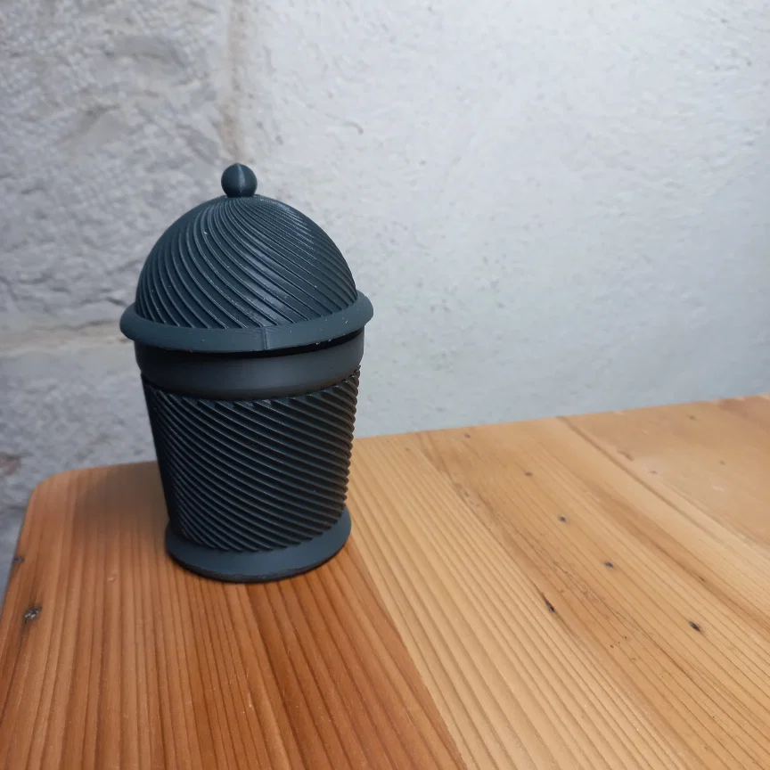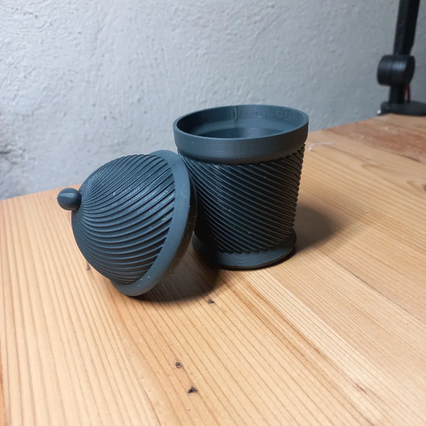 Chiếc hộp in 3D nhỏ gọn này được thiết kế để tận dụng các tính năng của FreeCAD (như Curves và công cụ Sweep trong Part). Mục tiêu là tạo ra một chiếc hộp có rãnh với thiết kế tổng thể hài hòa giữa phần thân ly và nắp. Phần thân ly in được mà không cần dùng support. Riêng phần nắp thì cần support ở các cạnh, còn lại phần thân được tính toán với độ nghiêng hợp lý giúp in ấn dễ dàng mà không gặp vấn đề gì.