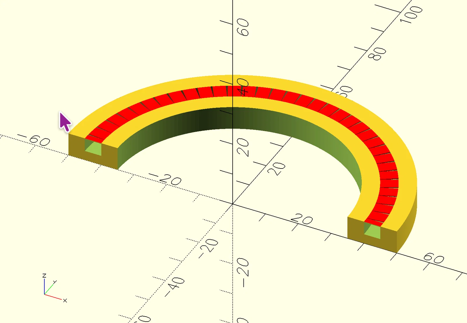 Số lượng hình chữ nhật phụ thuộc vào chiều dài của rãnh. Chúng ta cần đảm bảo có các khe hở cực nhỏ giữa các hình chữ nhật để slicer tạo perimeter riêng cho từng cái. Vì vậy, ta tính chu vi bán kính trong của rãnh và chia cho chiều rộng hình chữ nhật:
