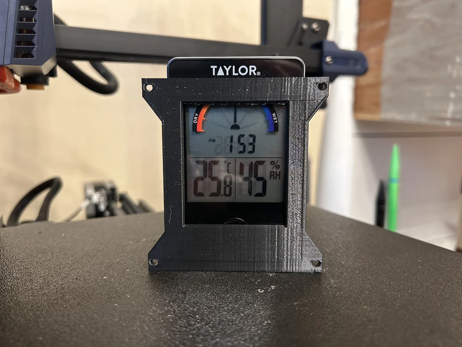 Mẫu này nên được in ở hướng mặc định với hỗ trợ (supports) cho cạnh trên của khe hở màn hình. Nó được thiết kế để giữ nhiệt kế / ẩm kế hiệu Taylor với màn hình phẳng áp sát vào tấm vách của tủ Lack. Thiết bị được gắn cố định bằng 4 bộ ốc vít M3.