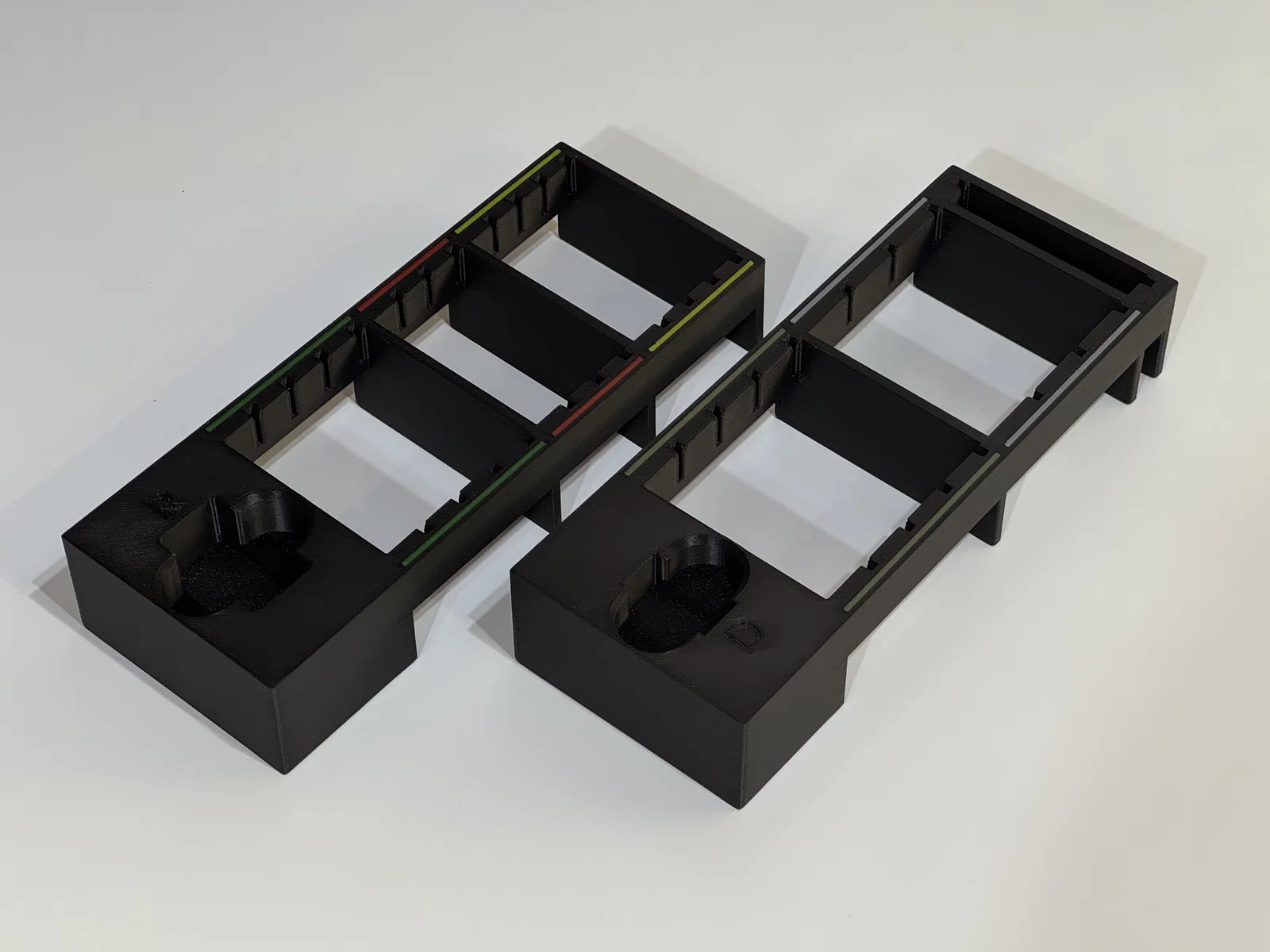 Các bộ phận này nên được in với mặt hướng lên trên, không cần hỗ trợ (support), không có gì phức tạp cả. Rất vừa vặn trên máy in Core ONE. Tôi đã sử dụng tính năng thay đổi màu thủ công một lần để tạo các bến tàu màu nâu trên nền nước màu xanh. ##### KHAY GIỮ (HOLDERS) Cần 1x HOLDER 1 và 1x HOLDER 2 để giữ tất cả các thẻ tài nguyên. Những khay này cũng có chỗ để 2 viên xí ngầu (D) và quân cướp (R).