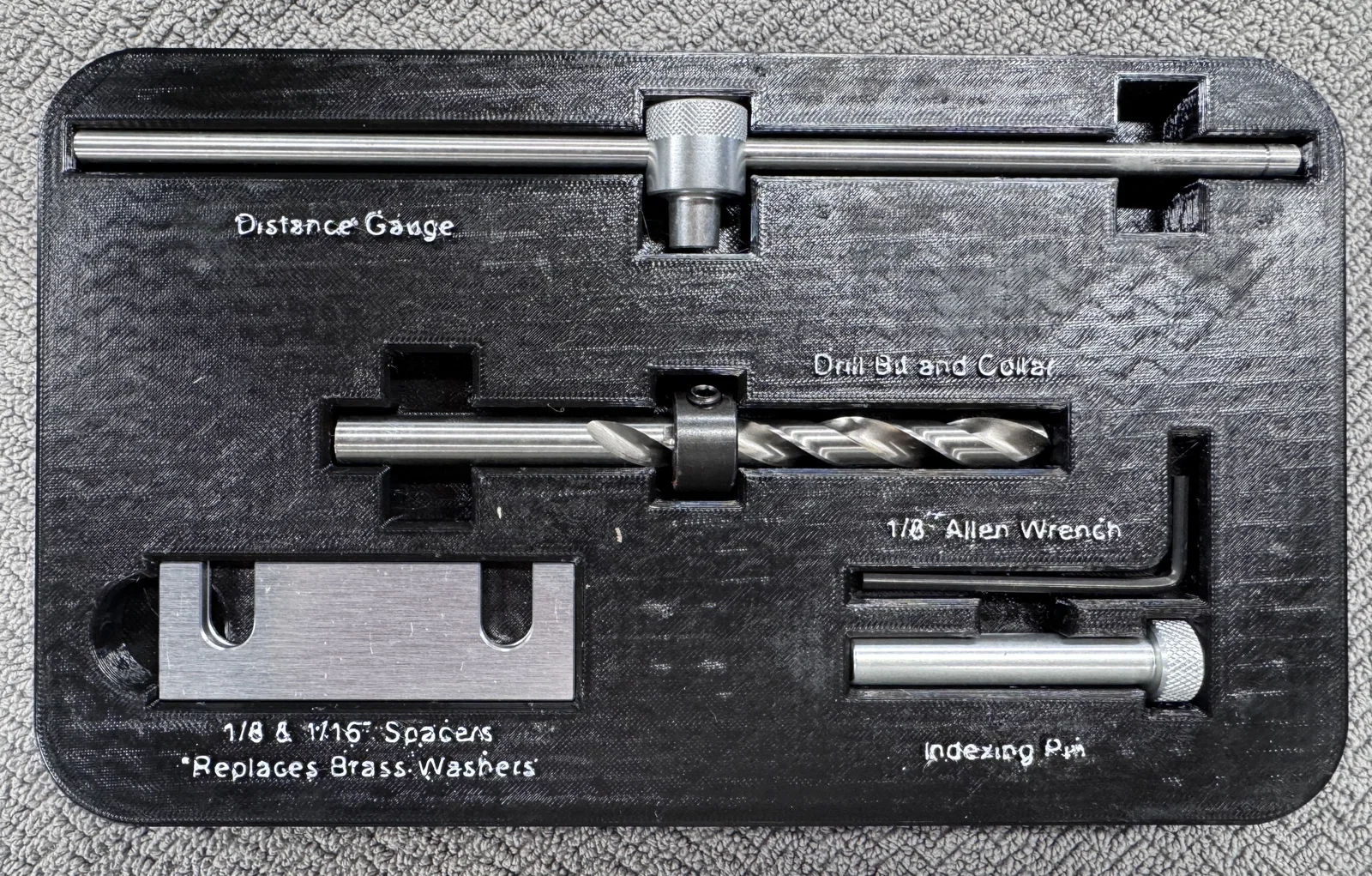 Tui không khoái cái hộp bìa cứng với miếng xốp đi kèm theo bộ jig này chút nào nên tui đã tự thiết kế cái mới. Tui mô phỏng lại các khay giữ dựa theo miếng xốp trên và dưới của hãng. Mẫu in này có các lỗ để bạn gắn thêm nam châm 6mm giúp cố định hai phần lại với nhau. Tui cũng đã dập nổi nhãn cho từng ngăn để bạn biết vị trí đặt các linh kiện của bộ jig. (Trong hình minh họa, phần nhãn được làm nổi và tui có tô màu thêm, còn trong file thiết kế mới này, tui đã làm theo kiểu dập chìm). Nó nằm vừa vặn trong ngăn kéo, giúp bảo quản bộ jig sạch sẽ mà vẫn lấy ra sử dụng rất tiện khi cần.