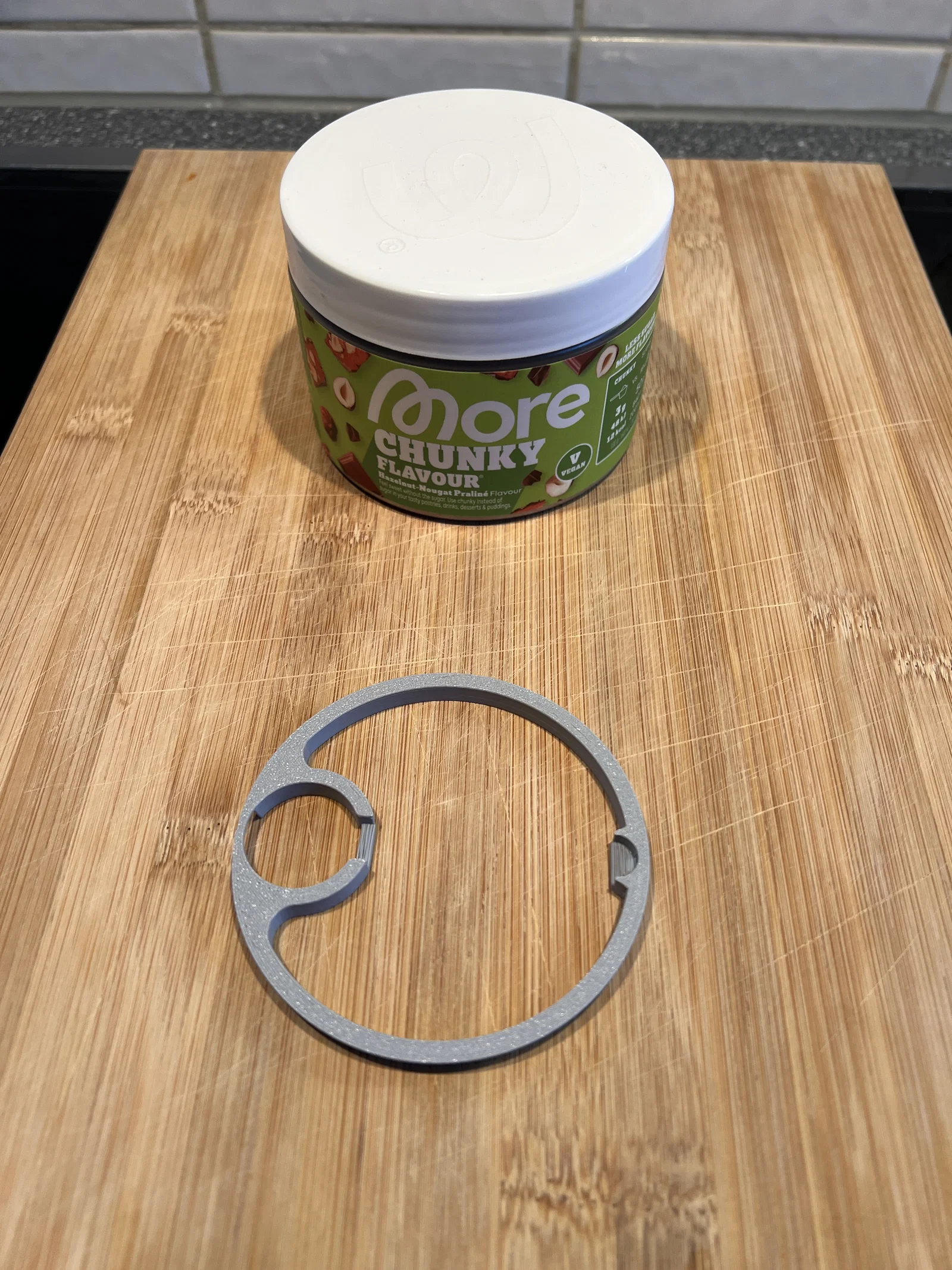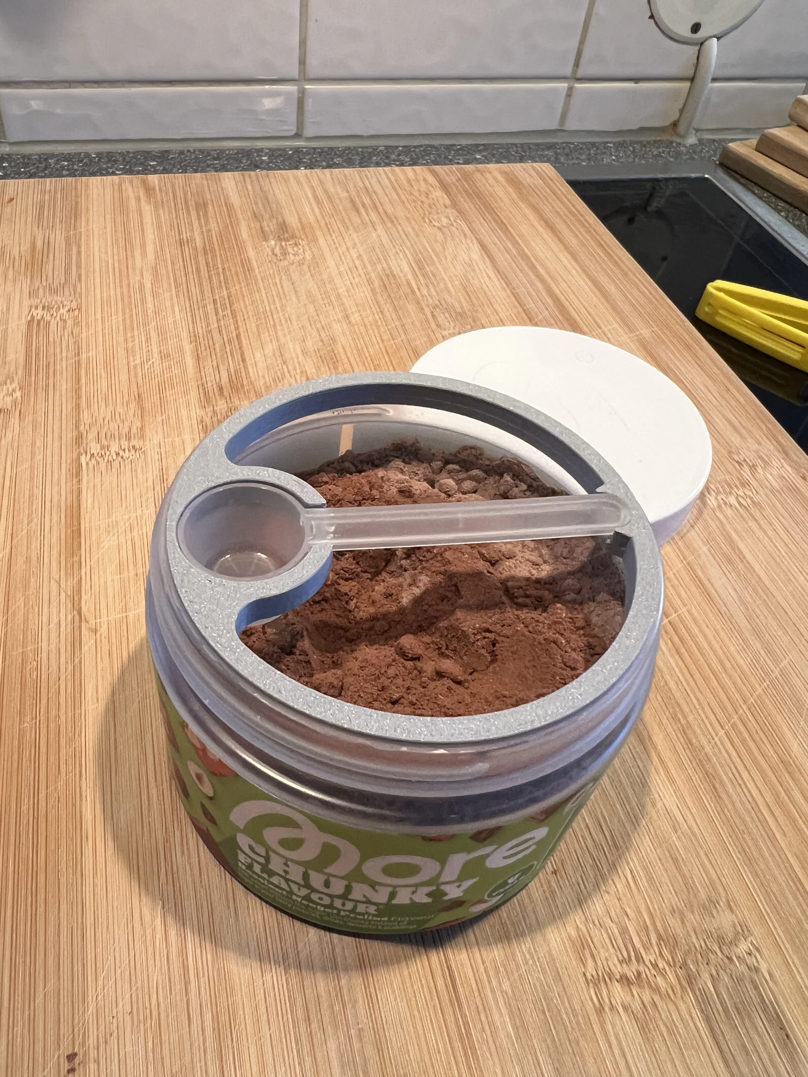 Chắc hẳn ai dùng Chunky Flavour cũng từng gặp cảnh phải đào bới tìm cái muỗng rồi dính đầy bột lên tay đúng không nè? Tui cũng thấy bất tiện lắm nên mới làm cái đồ gài muỗng này, giờ thì muỗng lúc nào cũng nằm sẵn trên miệng hộp, lấy ra dùng cực kỳ tiện lợi. Cái này được thiết kế chuẩn để khớp với mấy hộp 150g loại vỏ hơi đục nha.