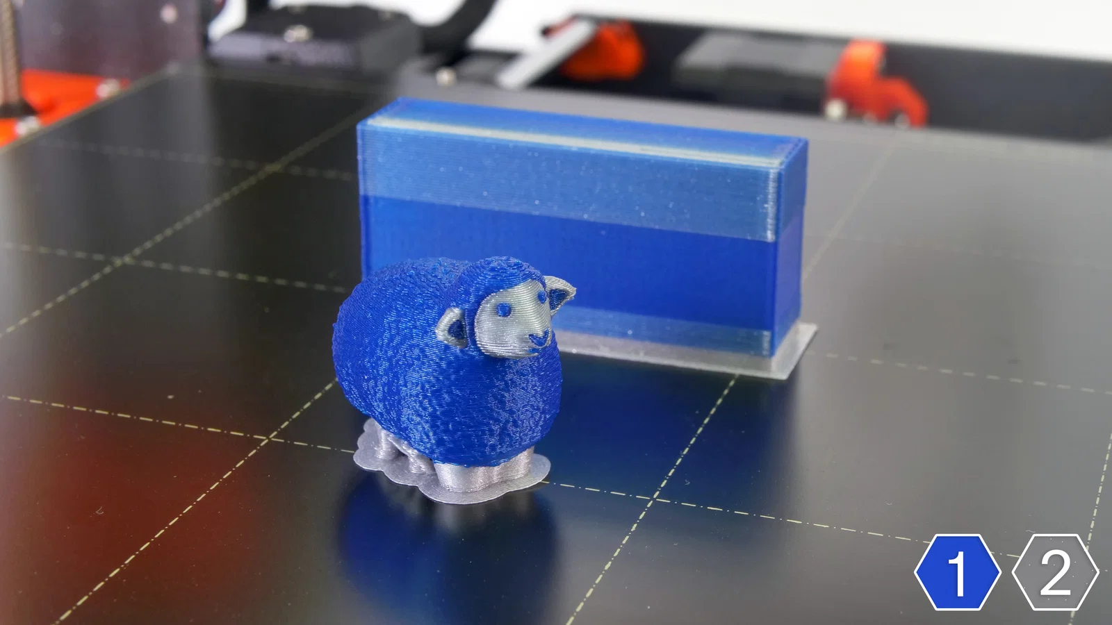 Mô hình chú cừu được thiết kế lại để in đa vật liệu (2 màu). Thời gian in khoảng 2 giờ 40 phút với độ phân giải 200 µm. Cấu hình in bao gồm Extruder 1 màu xanh dương và Extruder 2 màu bạc.
