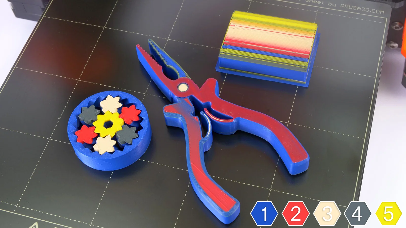 Thời gian in mất khoảng 5 tiếng ở độ cao lớp in 200 µm với 5 loại vật liệu khác nhau. Ext. 1 – Xanh dương Ext. 2 – Đỏ Ext. 3 – Xanh lá Ext. 4 – Vàng