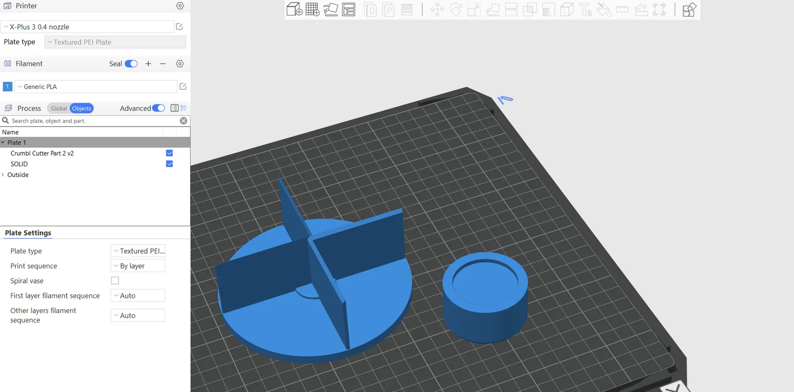 Hướng dẫn in: Sử dụng phần mềm slicer để tách vật thể (nắp và đế). Nắp và đế là hai bộ phận riêng biệt. Đặt mặt phẳng của khuôn nằm xuống bàn in (xem hình minh họa).