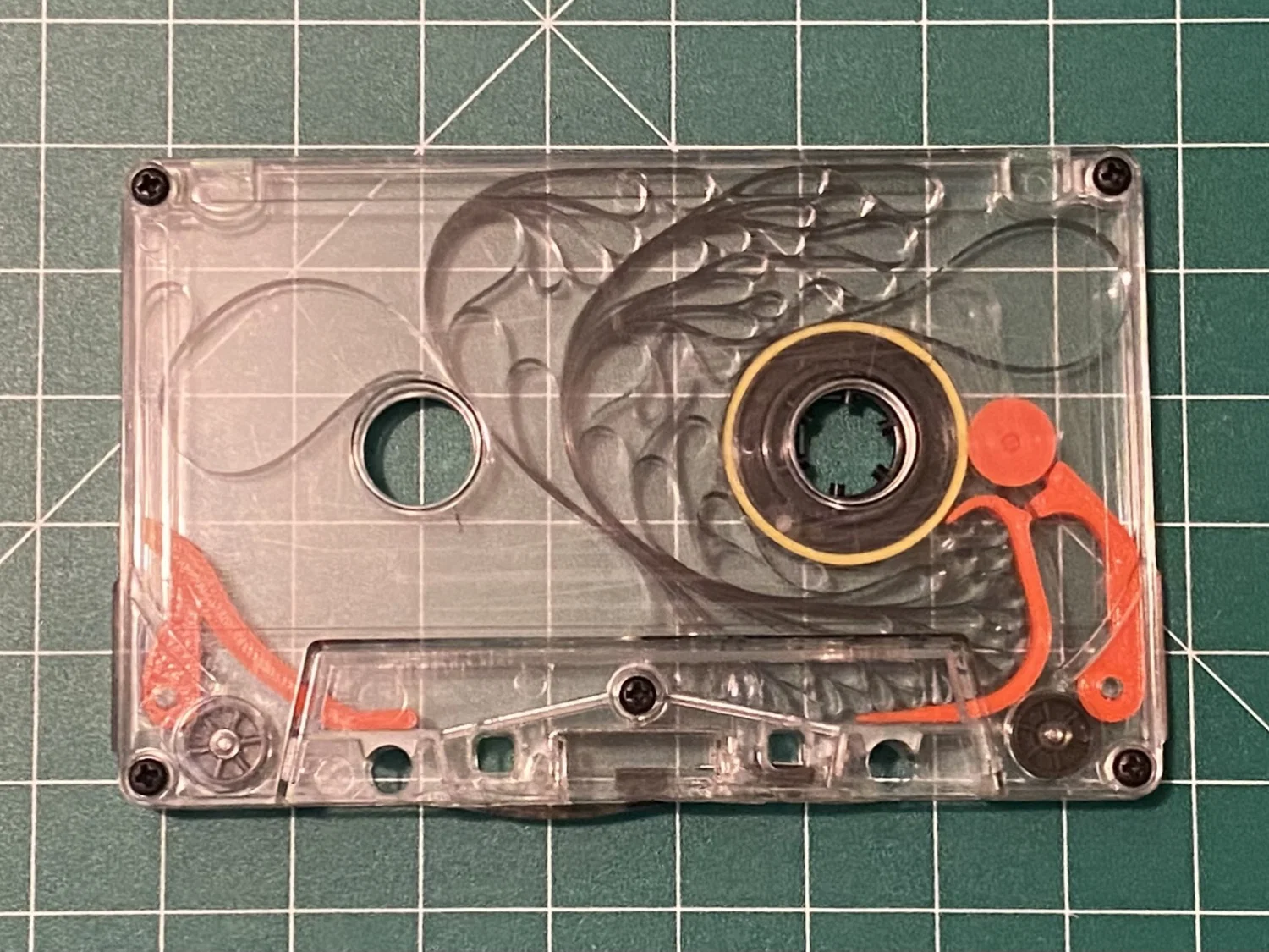 Các linh kiện in 3D gồm LeftSide.stlRightSide.stl sẽ lắp vừa khít lên các trụ nhựa bên trong vỏ băng cassette. Bánh xe dẫn hướng (idler wheel) được lắp vào trục của RightSide.stl; hãy đảm bảo nó xoay thật trơn tru với lực cản thấp nhất có thể. Bạn cần dán một sợi dây thun bản rộng 1/4 inch vào guồng băng để nó có độ bám giúp kéo băng hiệu quả.