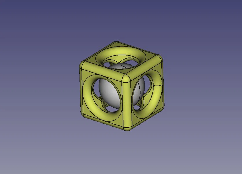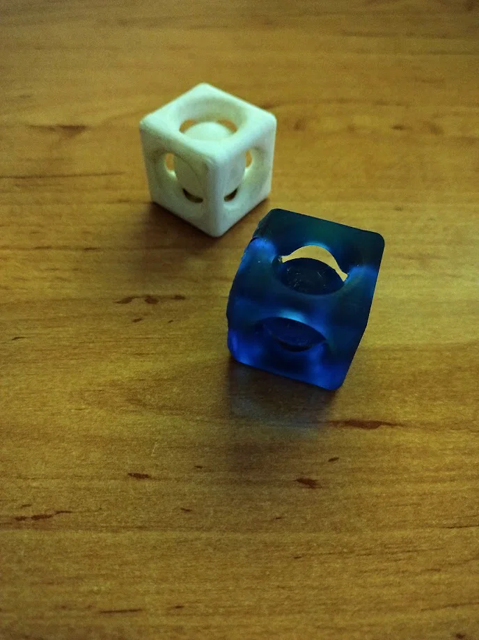 Một khối vuông 30x30mm đơn giản với viên bi nằm bên trong. Mình rất thích dùng món đồ chơi này để giải tỏa căng thẳng. Mình đã tạo ra mô hình này khi đang học sử dụng Freecad. Mình cũng đã in thử rất nhiều phiên bản của khối vuông này như một mô hình kiểm tra, bao gồm cả việc in bằng nhựa trong suốt trên máy in SLA của mình.
