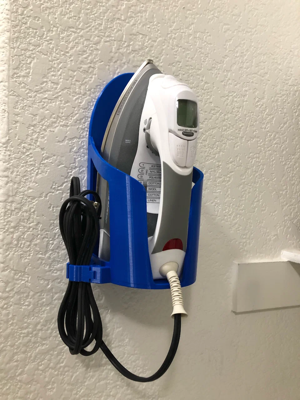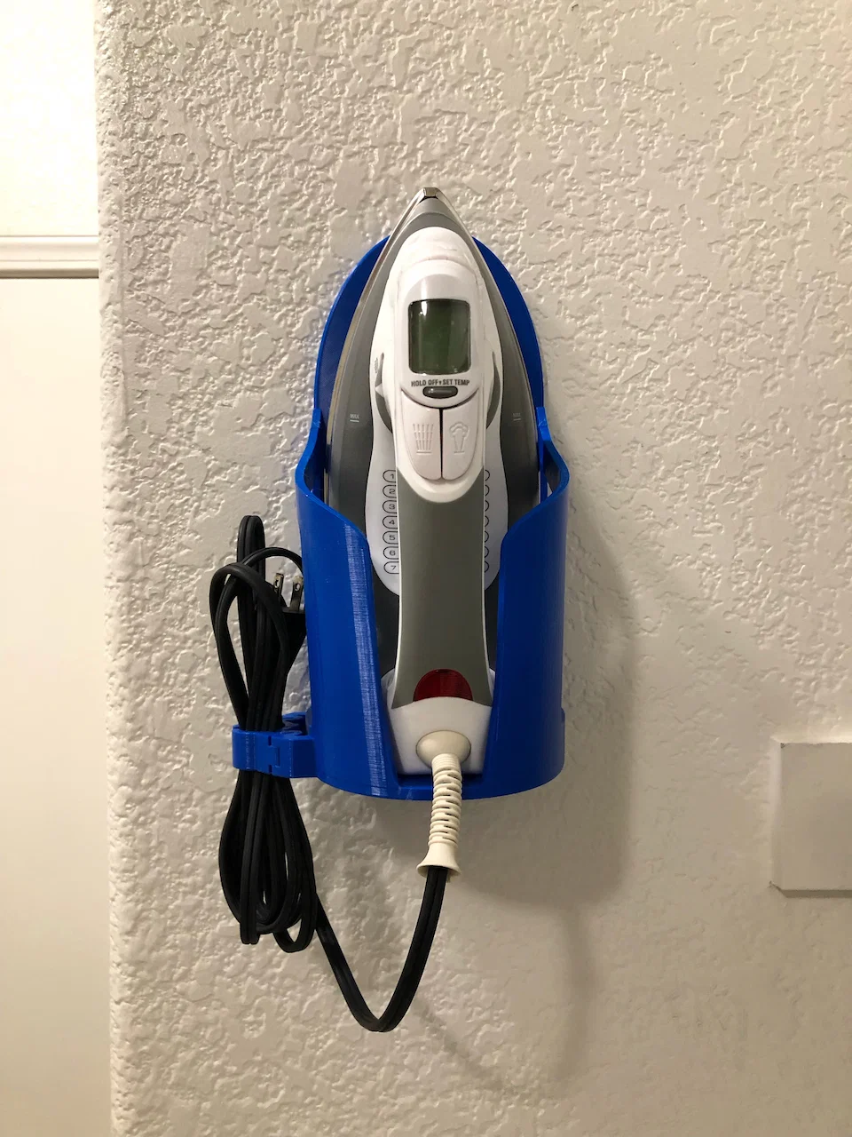 Đây là giá treo bàn ủi gắn tường giúp không gian của bạn gọn gàng hơn. Việc cuộn dây điện mỗi lần sử dụng quá mất thời gian, nên mình đã tích hợp thêm chốt giữ dây của thegrateman (https://www.prusaprinters.org/prints/110550-customisable-latching-broom-holder) – bạn chỉ cần nhét gọn dây điện vào là xong.