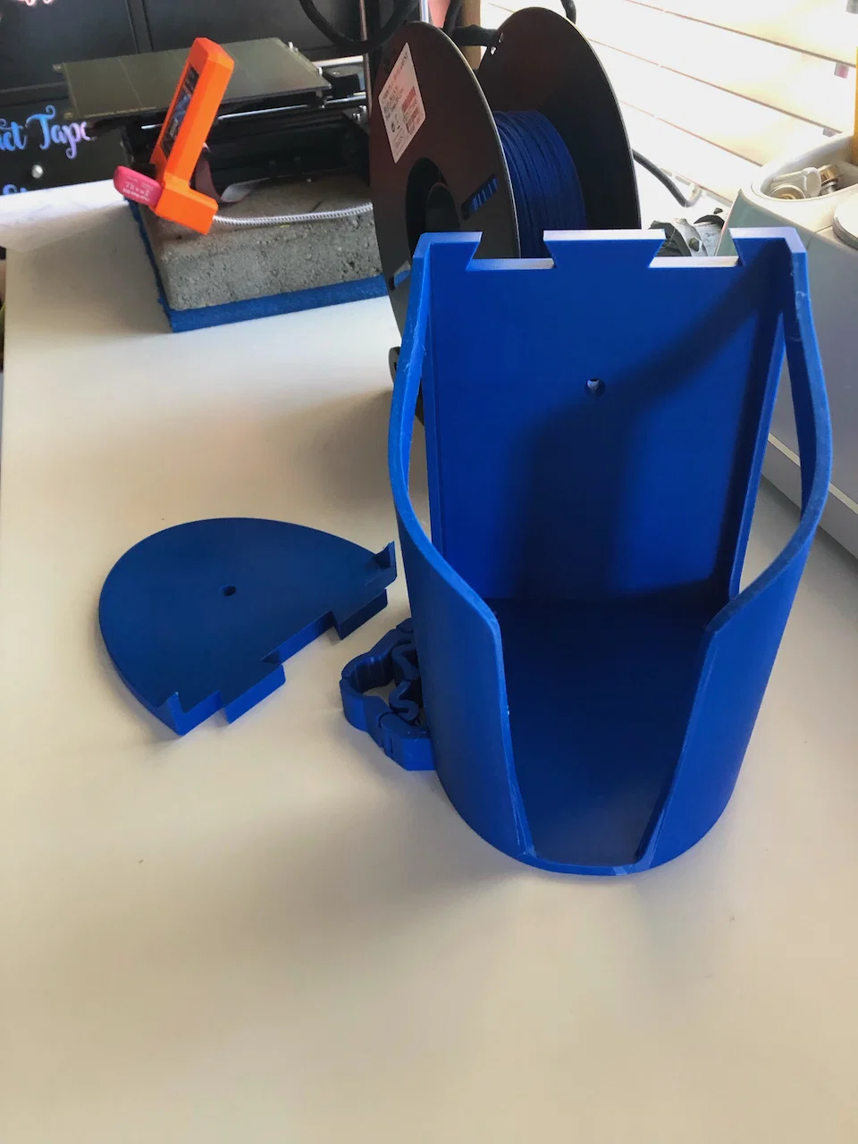 Sản phẩm được in bằng nhựa PLA trên máy Mini+ thành hai phần riêng biệt, sau đó dán lại với nhau bằng một ít keo dán sắt (cyanoacrylate).