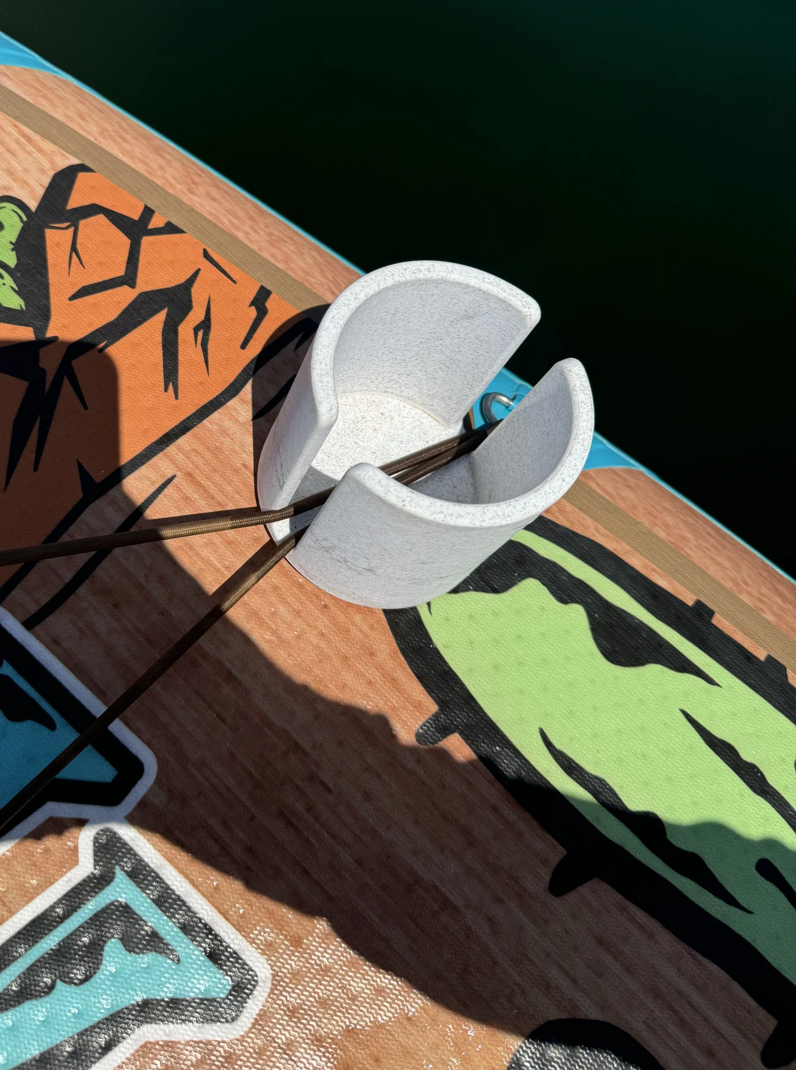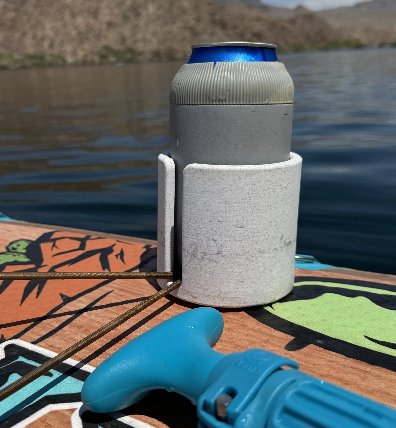 Để giữ ly/lon chắc chắn hơn, bạn có thể hơ nóng giá đỡ dưới nắng một chút rồi bóp nhẹ phần miệng lại. Khi nguội đi, nó sẽ ôm chặt lấy lon/koozie, giúp hạn chế bị rơi khi ván rung lắc trên mặt nước.