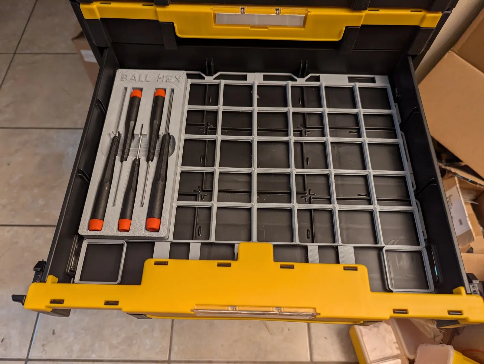 Đế Gridfinity tối giản dành cho các ngăn kéo Dewalt Tstak 2 tầng. Thiết kế này cũng có thể tương thích với ngăn kéo Craftsman Versastack. Sản phẩm được chia thành 4 phần để in dễ dàng, sau đó chỉ cần dán lại với nhau.