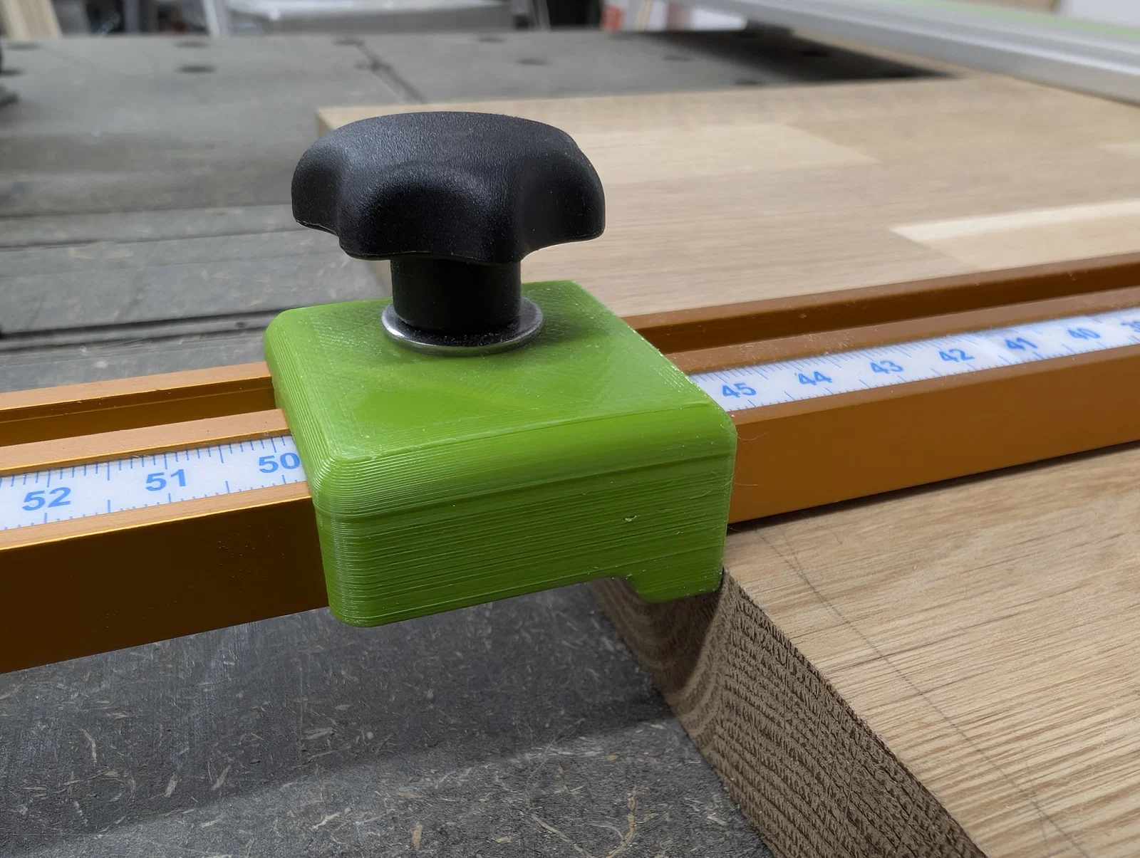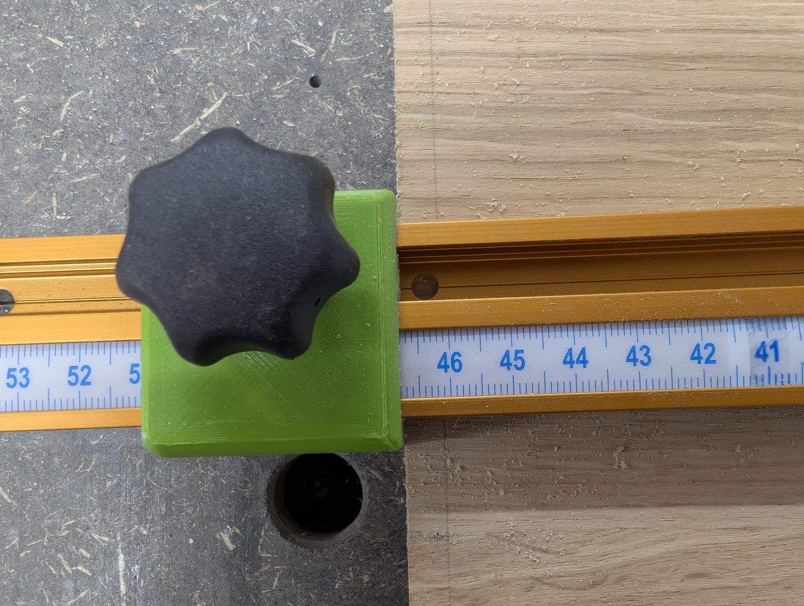 Việc điều chỉnh các chốt chặn rất dễ dàng, trong khoảng từ ~235mm (9,25") đến ~1090mm (42,91") khi dùng thanh T-Track 910mm (36").