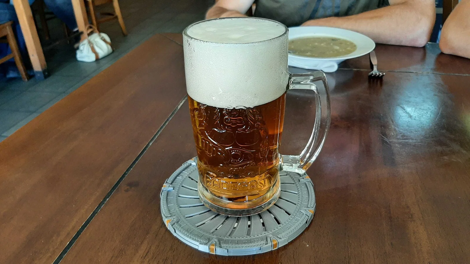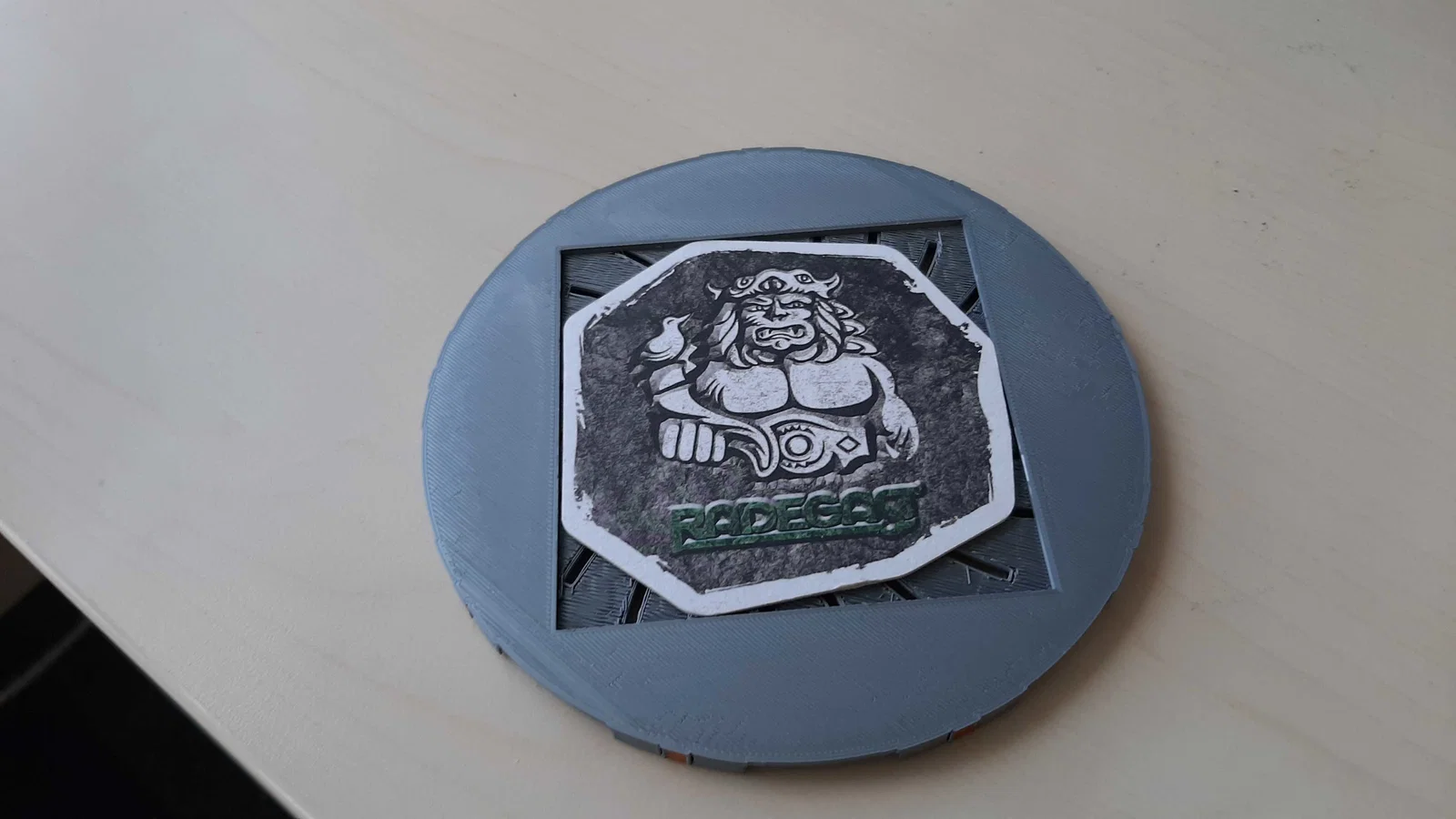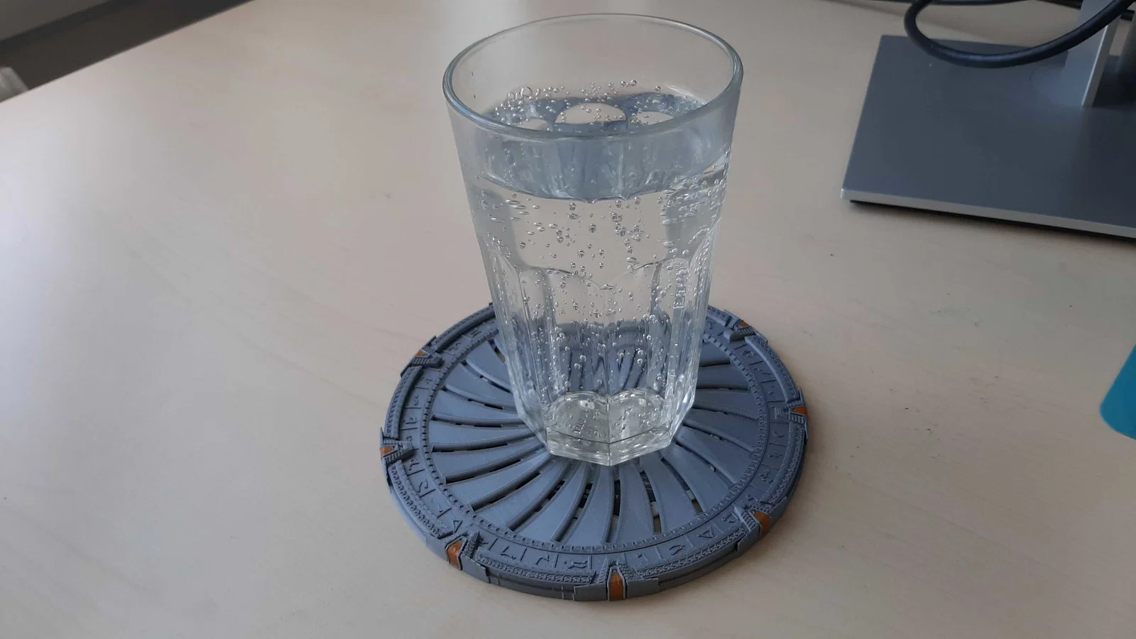 Đây là mẫu đế lót ly do mình tự thiết kế, lấy cảm hứng từ cổng Stargate với phần Iris đi kèm. Kích thước đế hơi lớn một chút vì mình thích dùng ly bia 1 lít (kiểu Tuplák) nên chiếc đế này vừa vặn rất đẹp. Phần Iris được thiết kế có các lỗ nhỏ để dẫn nước ngưng tụ thoát ra ngoài, giúp mặt đế không bị đọng nước. Ngoài ra, phía dưới còn có một hốc nhỏ để bạn đặt vừa khít một miếng lót ly bằng giấy tiêu chuẩn. Việc này giúp thấm hút sạch nước, giữ cho mặt bàn luôn khô ráo. Bạn hoàn toàn có thể bỏ qua bước này nếu không thích nhé.