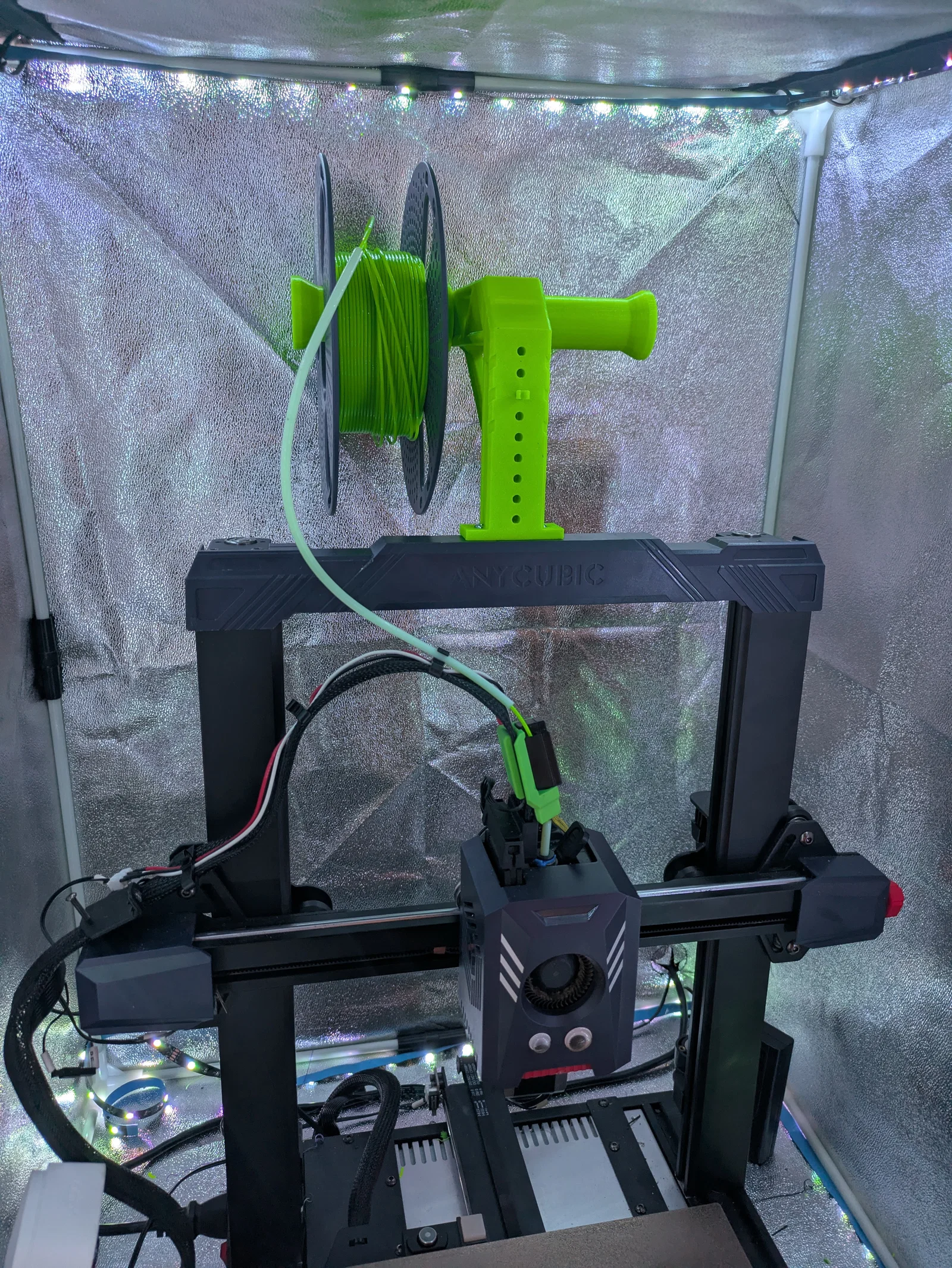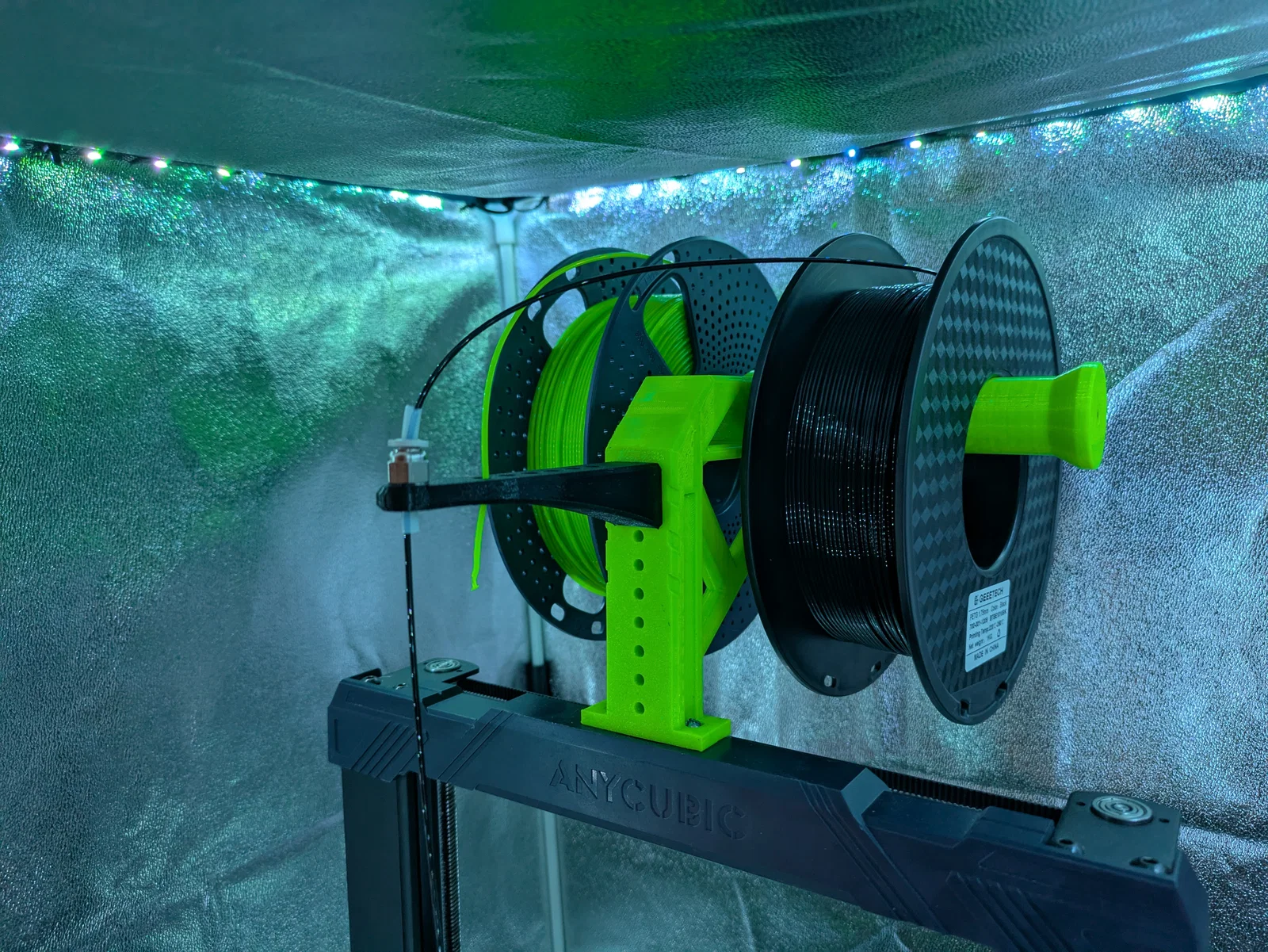 Mình tạo ra mô hình này vì giá đỡ cuộn nhựa đi kèm máy của Anycubic làm máy chiếm quá nhiều diện tích, còn mấy loại khác thì lại để cuộn nhựa xoay 90° so với hướng nhả nhựa, điều này cực kỳ tệ khi in TPU (nhựa bị giãn, in ra lỗi lắm).
