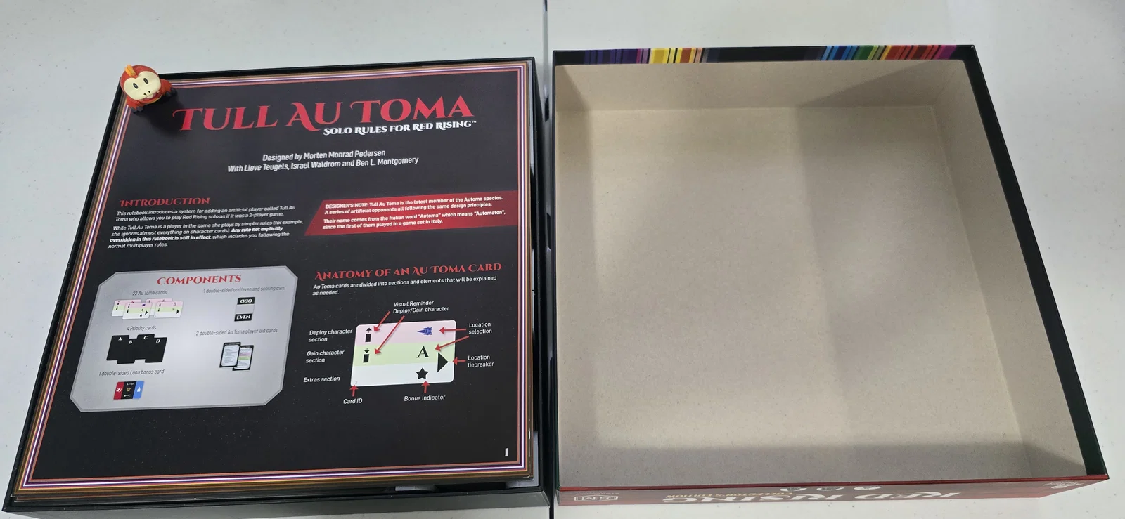 • Mình tìm thấy một mẫu thiết kế bởi ThoxicThox để giữ khay thẻ đứng và đựng mảnh người chơi. Mình đã thiết kế khay của mình dựa trên ý tưởng tận dụng PlayerBoard của ThoxicThox.