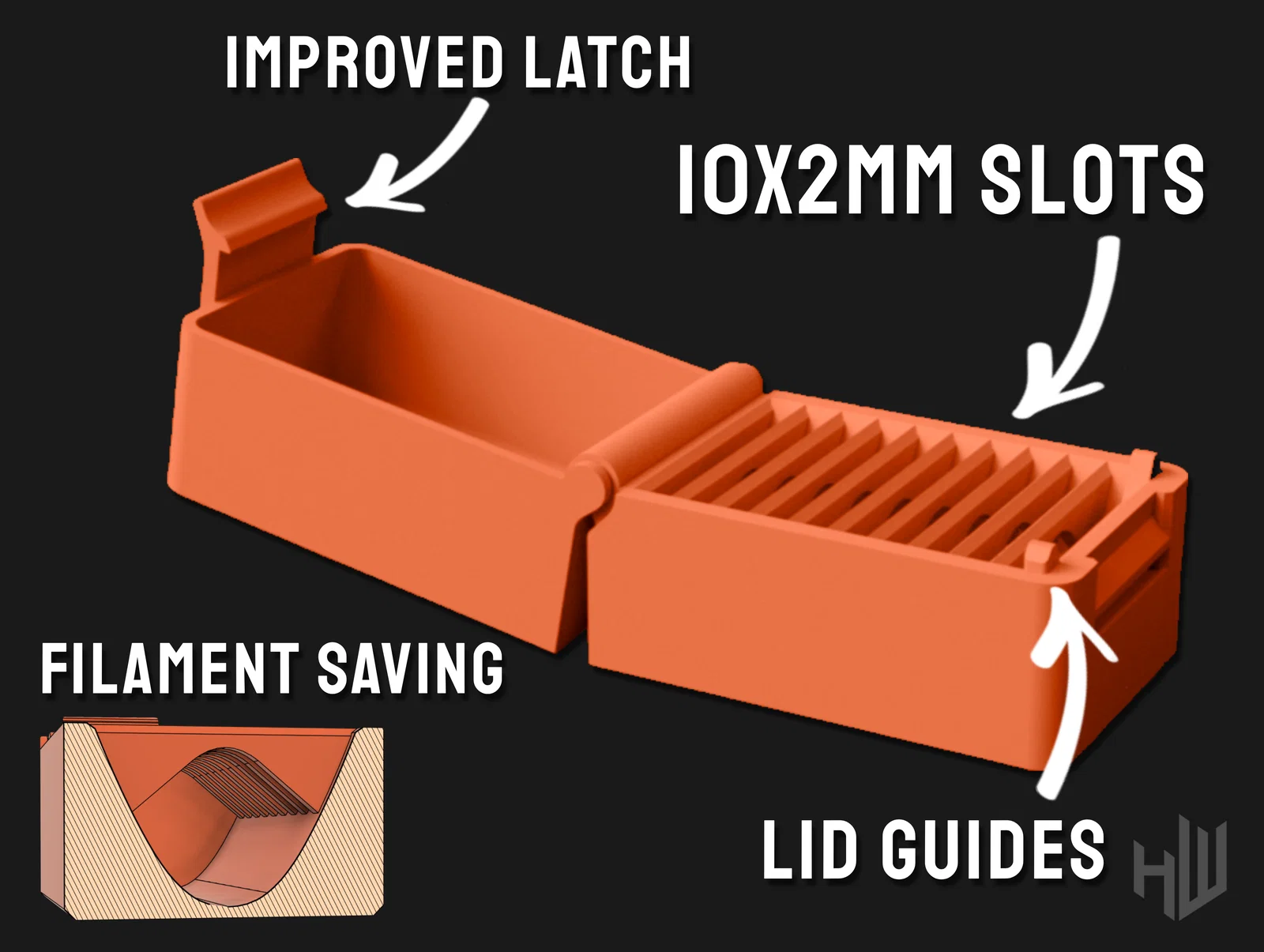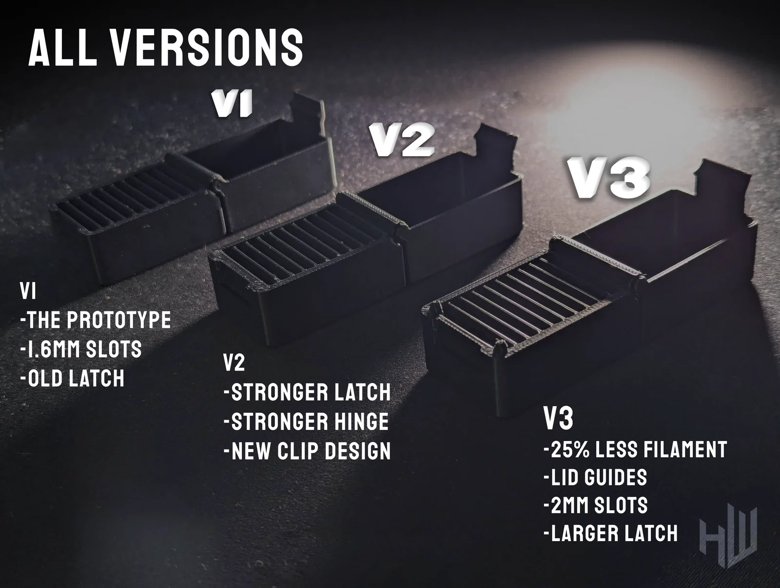 Phiên bản V3 của chiếc hộp đựng 10 phím đàn guitar nhỏ gọn. Bản này được tối ưu hóa với khe cắm rộng 2mm, lẫy khóa chắc chắn, tiết kiệm 25% nhựa in và nắp đậy được cải tiến để khớp hoàn hảo. Thiết kế in liền khối không cần support.
