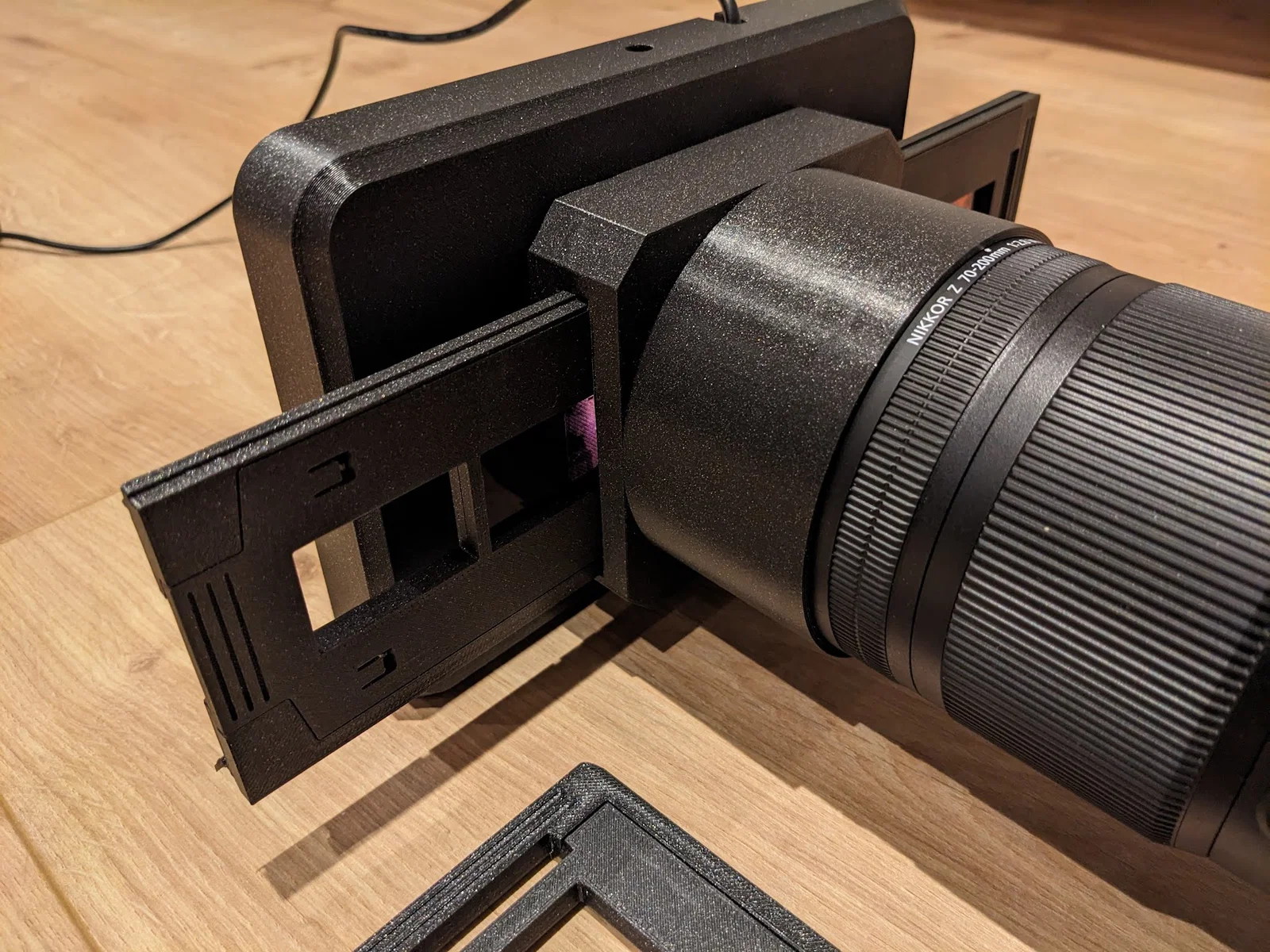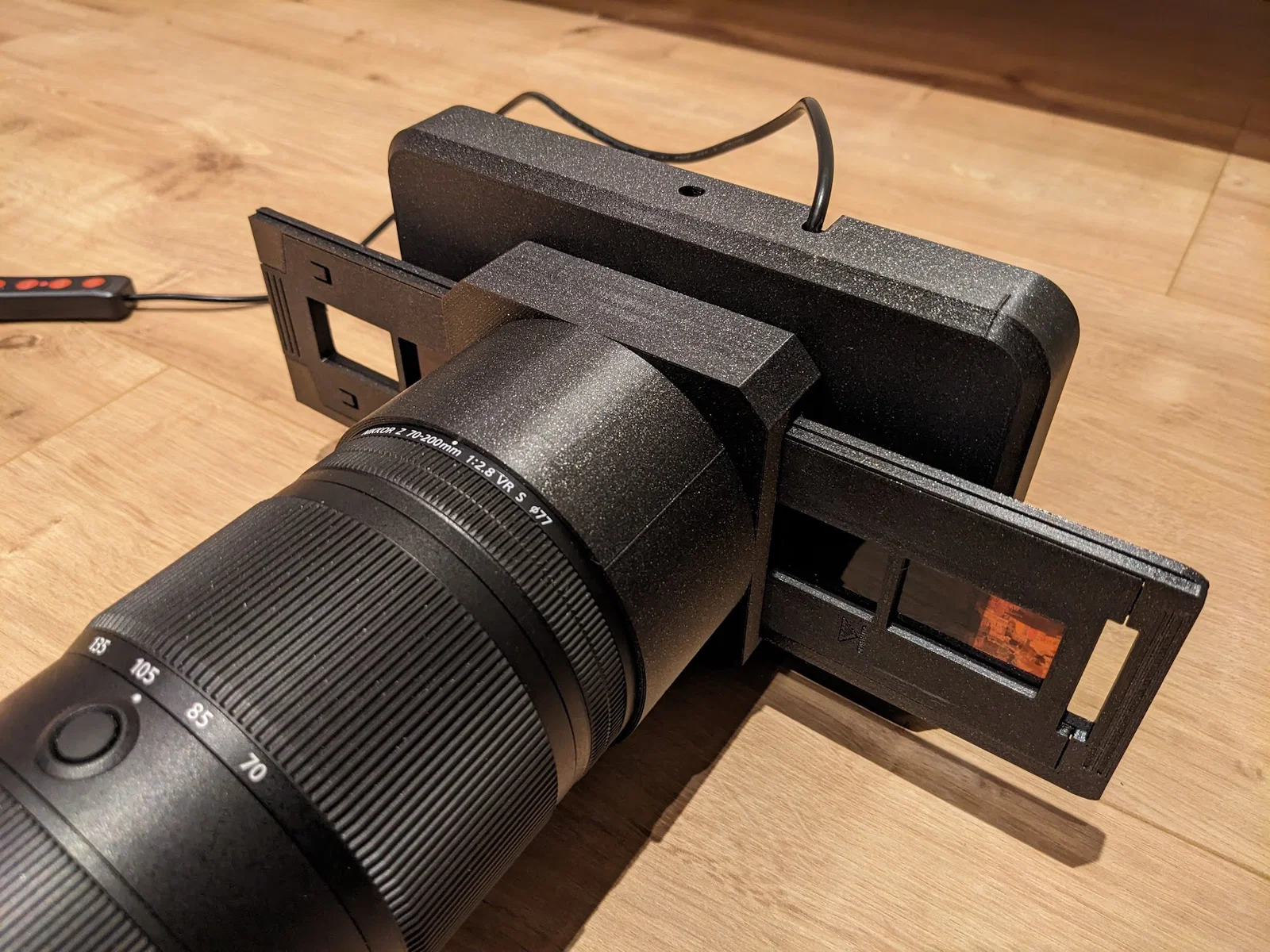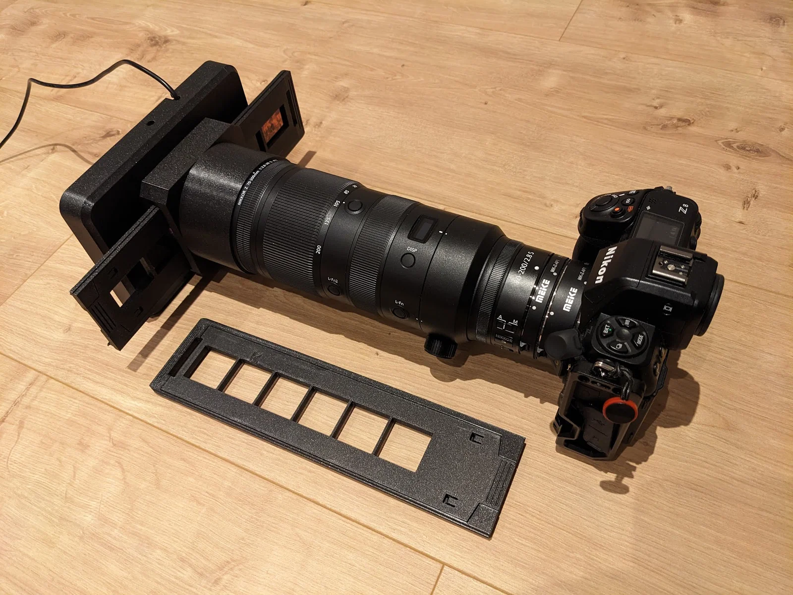 Bộ chuyển đổi giúp scan phim gắn vào lens hood Nikkor 70-200 F2.8, sử dụng khay Minolta Dimage Scan Dual III AF-2840. Hỗ trợ scan phim 35mm và 126 cinematic bằng máy ảnh DSLR của bạn, thiết kế linh hoạt và dễ dàng lắp đặt.