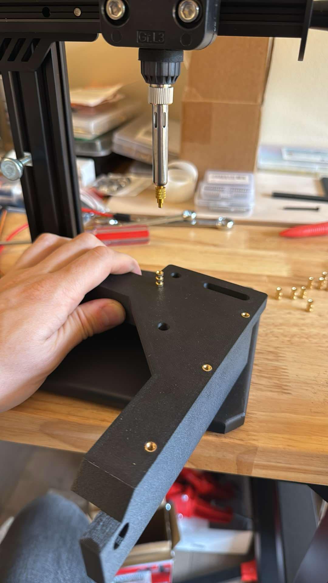 Mình in bằng nhựa ASA với kiểu infill triangle-hex 15% để đảm bảo độ cứng mà vẫn tối ưu thời gian in. Mình chọn chiều cao lớp in 0.2mm, độ rộng nét in 0.2mm và 6 lớp tường (perimeters). Mình đã thêm modifier với infill 100% cho các giá đỡ và các vách bên nơi bắt vít (để chịu lực nén tốt hơn và tăng độ cứng cho khung). Các tán cấy được ấn vào lỗ từ phía sau (đáy), sau đó phần nhựa dư do ấn tán cấy vào sẽ được khoan bỏ bằng máy khoan bàn. Mình khuyên các bạn nên thử lắp bu-lông M3 vào từng lỗ một để đảm bảo mọi thứ vừa vặn trơn tru trước khi lắp Starlink vào case. Thiết kế gốc sử dụng đai ốc cài bằng cách tạm dừng in giữa chừng, nhưng mình thấy cách đó dễ bị xoay đai ốc bên trong khi in. Hốc đai ốc vẫn còn trong mô hình nếu bạn muốn dùng đai ốc thay vì tán cấy. Mình khuyên bạn chỉ nên chọn một trong hai phương pháp thôi nhé.