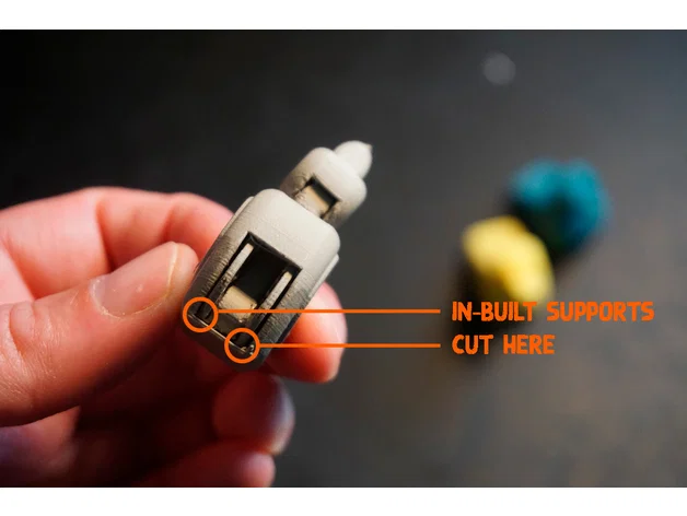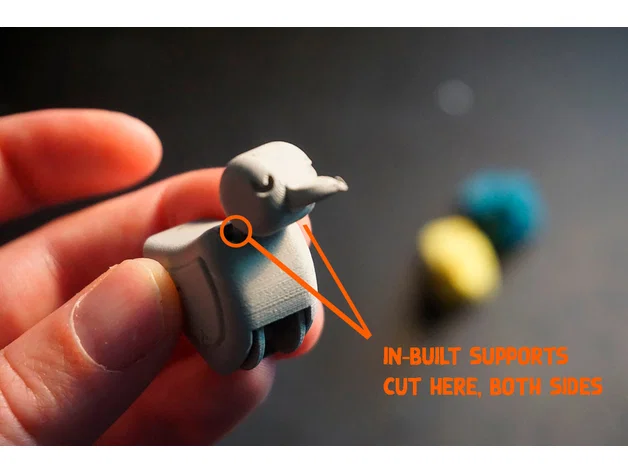 Mô hình này không cần tạo support trong slicer, nhưng sau khi in xong bạn cần loại bỏ vài chi tiết support tích hợp sẵn. Cách xử lý như sau: Dưới bụng con vịt có một mảnh nhỏ rất dễ bẻ gãy. Sau đó xoay nhẹ bánh xe và mài cho nó tròn đều ở vị trí vừa gỡ support. Khi bánh xe đã quay trơn tru, hãy xoay đến vị trí cổ lộ ra hoàn toàn. Bây giờ bạn có thể cẩn thận cắt bỏ phần support ở bên trái và phải của cổ, ngay dưới đầu. Đây có lẽ là bước hơi "khoai" một chút.