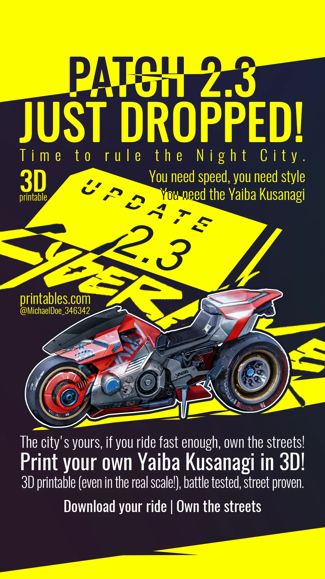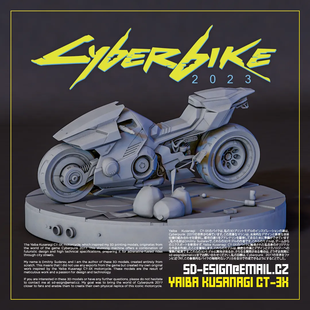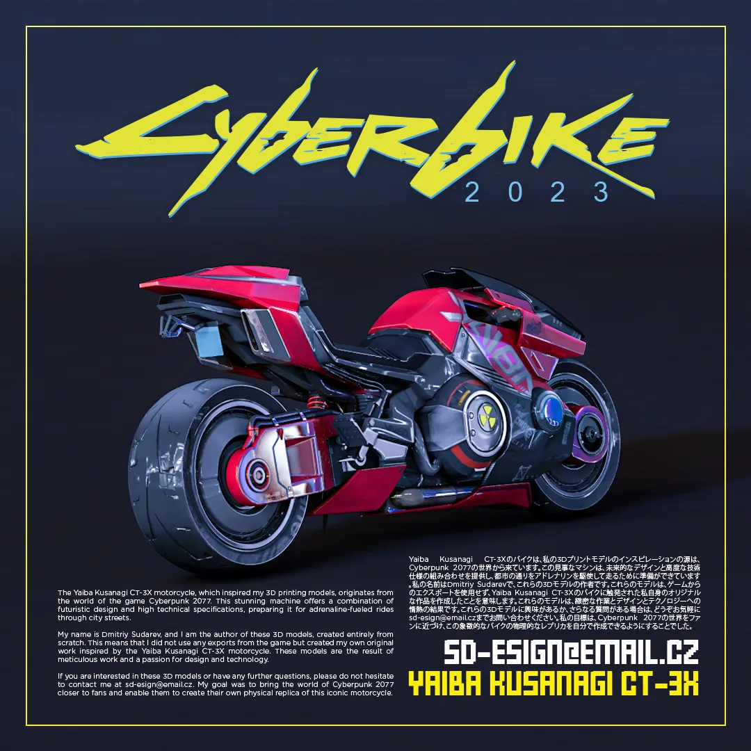 Mẫu xe mô tô Yaiba Kusanagi CT-3X truyền cảm hứng cho các mô hình in 3D của tôi có nguồn gốc từ thế giới game Cyberpunk 2077. Cỗ máy tuyệt đẹp này mang đến sự kết hợp giữa thiết kế tương lai và các thông số kỹ thuật cao, sẵn sàng cho những chuyến đi đầy phấn khích trên đường phố.