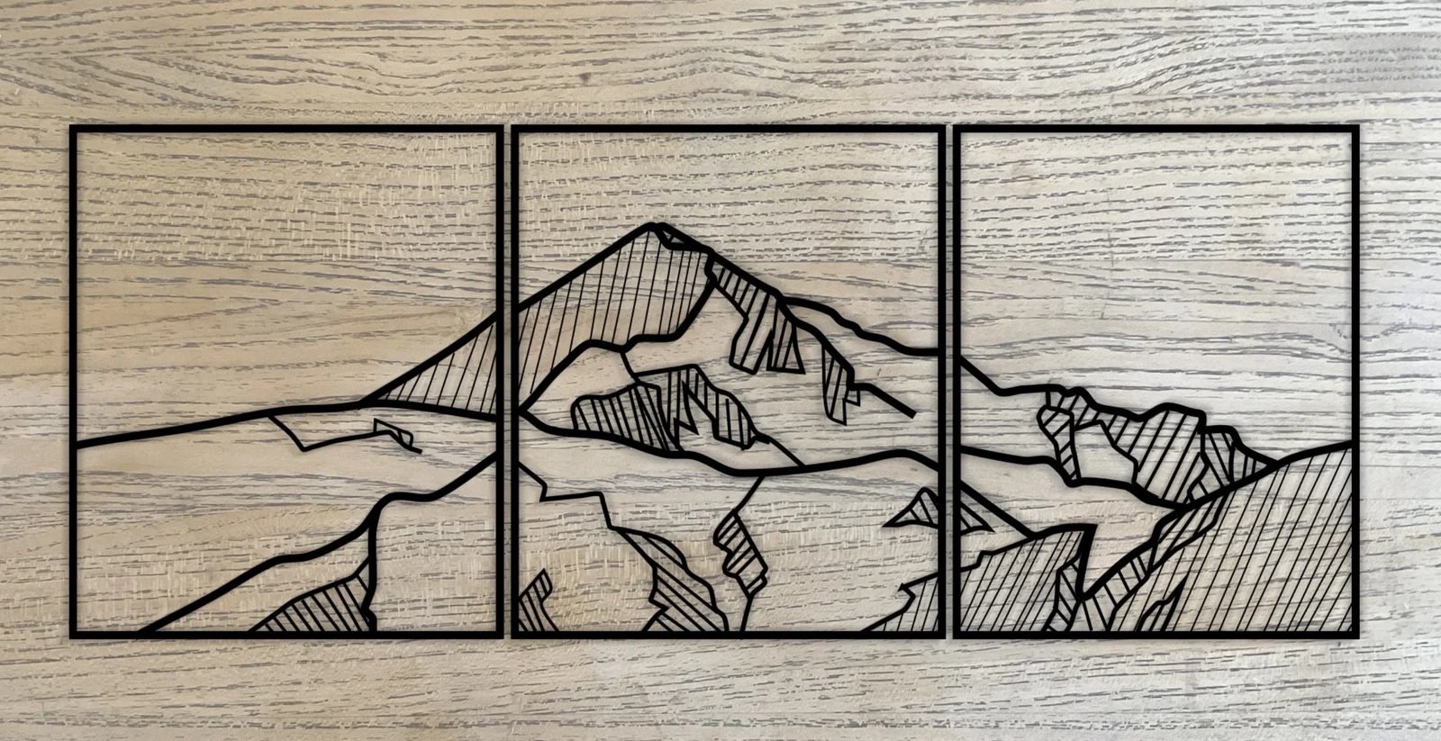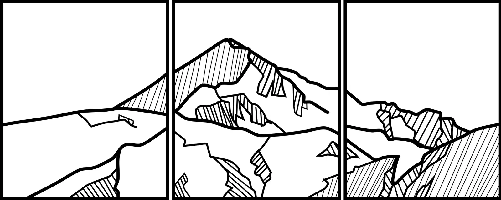 Bộ tranh bao gồm ba tấm hình được sắp xếp liền mạch, tạo thành một khung cảnh núi non bao quát và đầy tính nghệ thuật. Những đường nét hình học được tối giản hóa một cách khéo léo, kết hợp cùng các mảng đổ bóng dạng kẻ sọc giúp tạo chiều sâu cho tranh dù chỉ là thiết kế phẳng. Khi treo trên tường, sản phẩm này tạo ra điểm nhấn thị giác vô cùng ấn tượng, biến một mảng tường trống trải thành một không gian đầy tính thẩm mỹ và thư giãn.