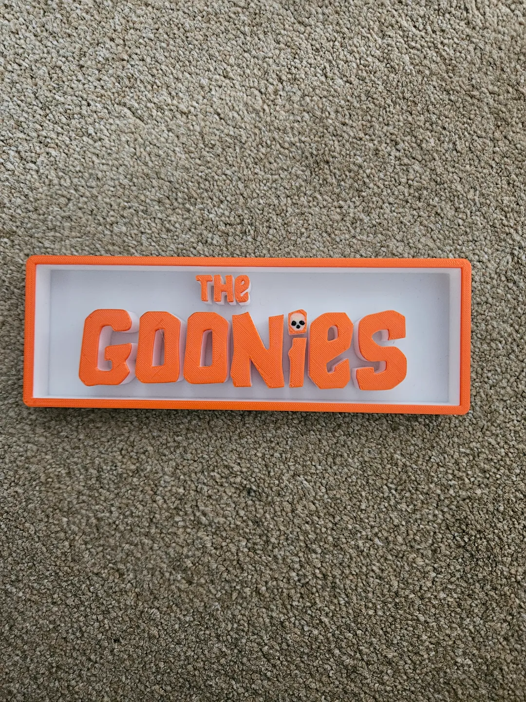 Bảng hiệu trang trí phòng phim/rạp chiếu phim chủ đề The Goonies. Bạn hoàn toàn có thể thay đổi màu sắc theo ý thích thông qua hệ thống AMS (Bambu) hoặc thiết lập cấu hình của máy in hiện tại mà bạn đang dùng.