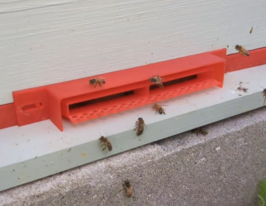 - Nên in bằng nhựa ABS hoặc ASA để có khả năng chống tia UV tốt nhất. Màu đỏ hoặc đỏ trong suốt là lựa chọn tối ưu vì làm nhiễu tầm nhìn của bọ cánh cứng nhỏ (SHB). Ngoài ra, các màu tím, xanh dương, cam và vàng cũng rất tốt vì ong dễ nhận biết các màu này nhất.