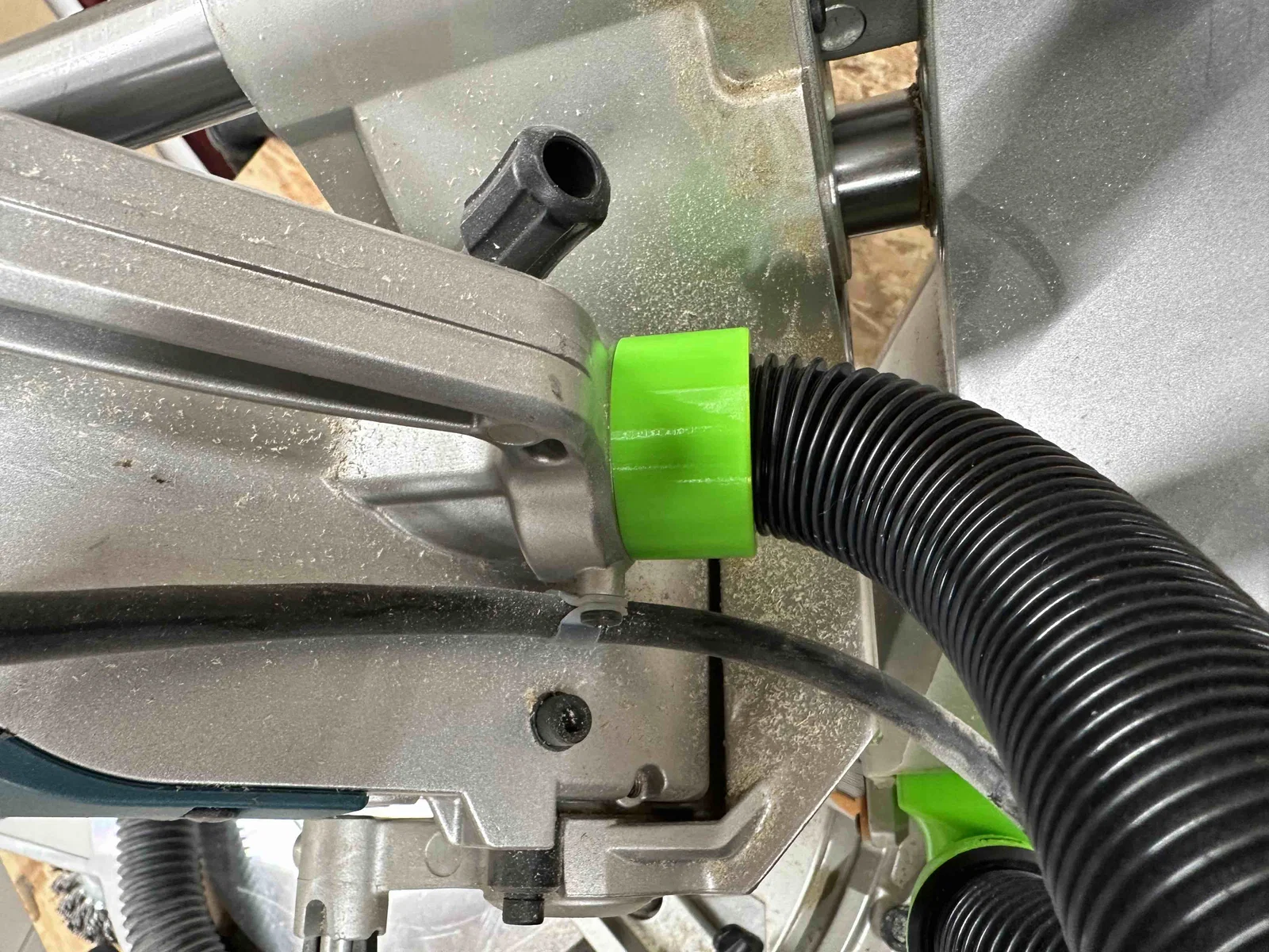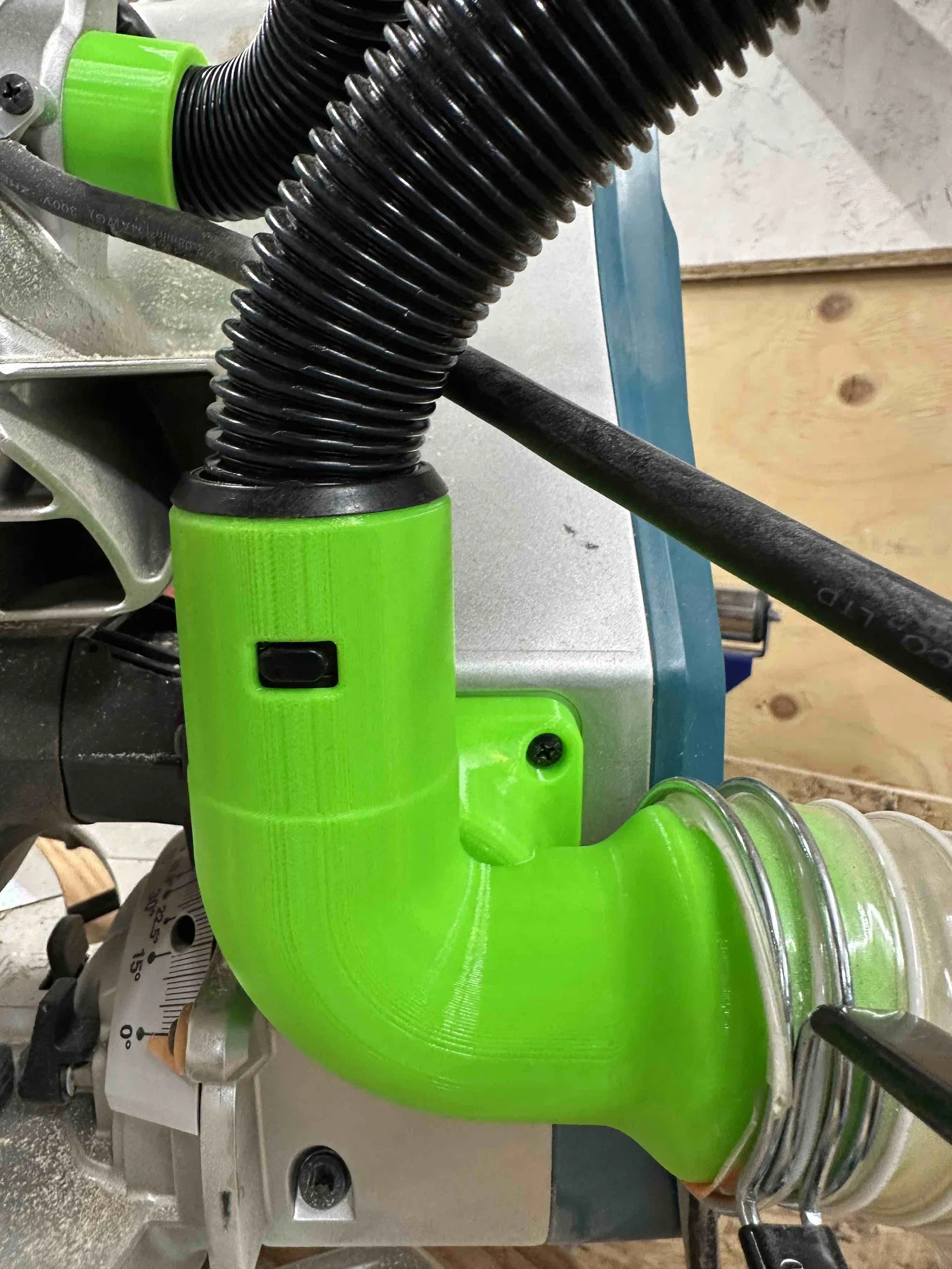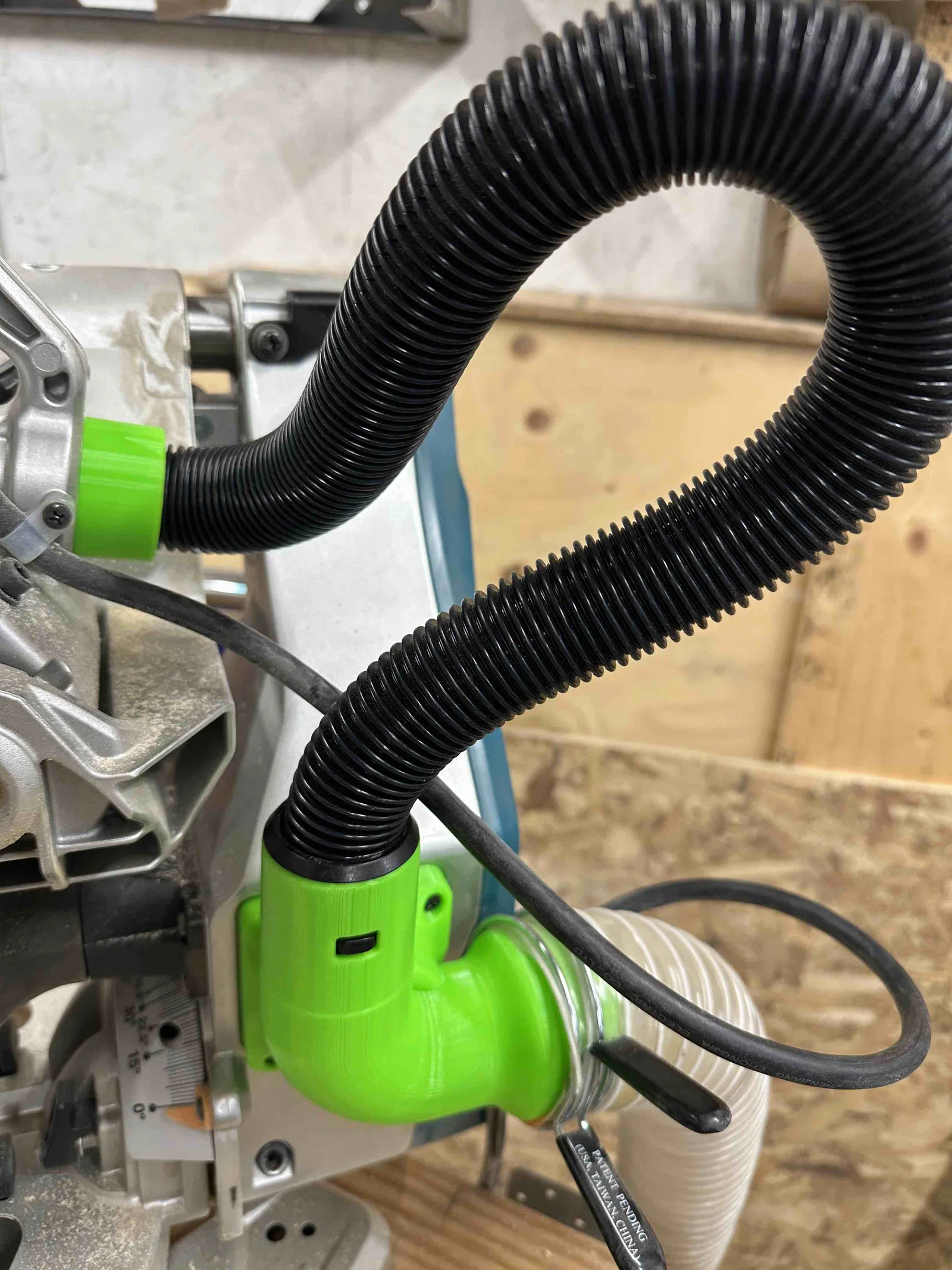Đầu ra ở bên hông gây cản trở khi mình nghiêng máy cưa một góc 45 độ về bên phải. Trước đây mình dùng phụ kiện bằng ABS nhưng nó quá rộng và bất tiện, mình phải tháo ra khi cắt một số góc. Vấn đề đã được giải quyết