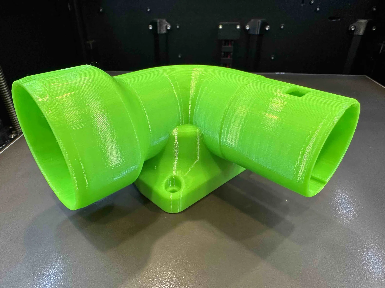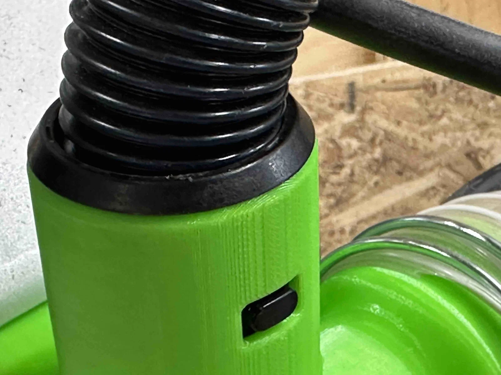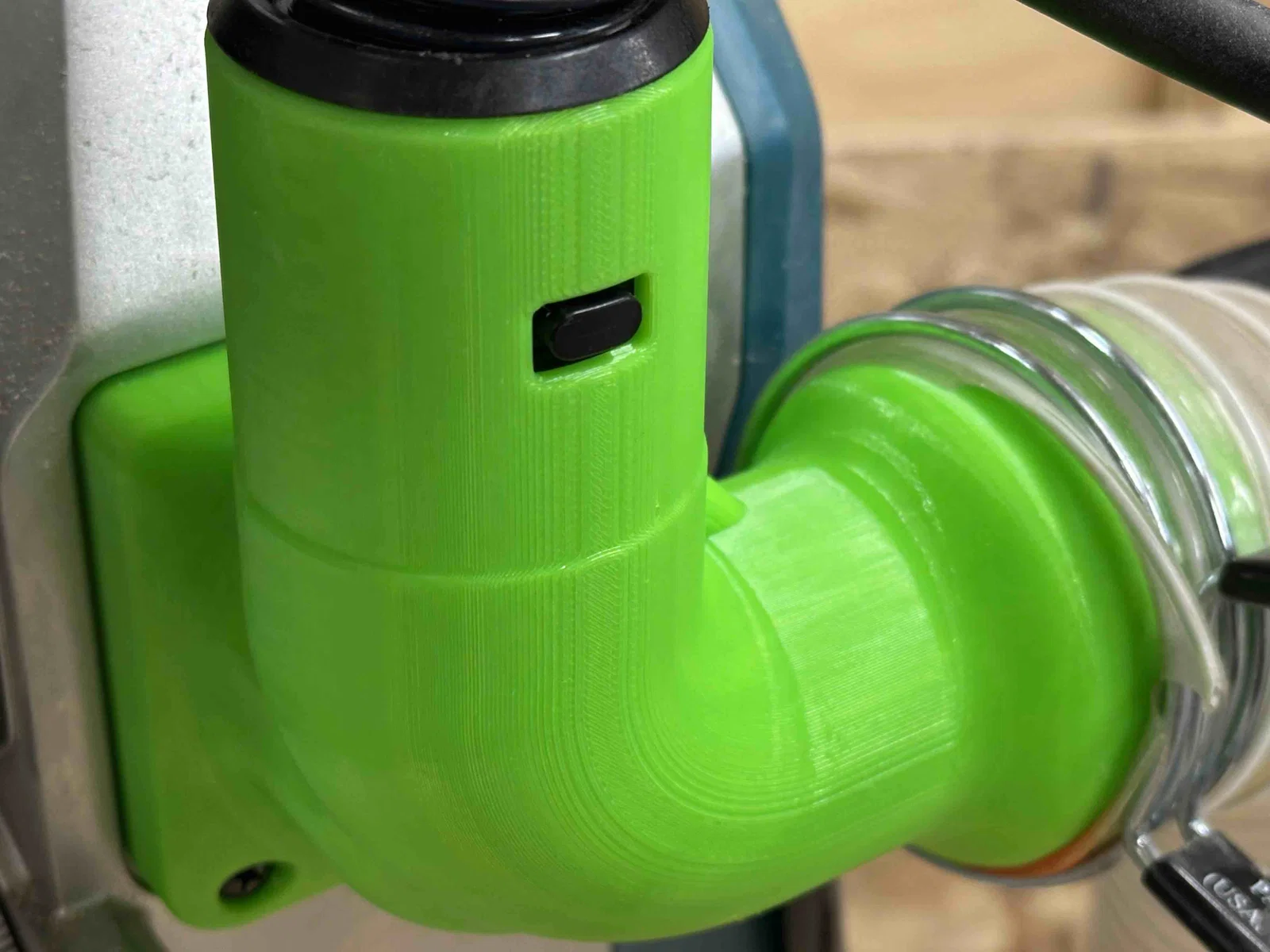 Đầu ra ở bên hông gây cản trở khi mình nghiêng máy cưa một góc 45 độ về bên phải. Trước đây mình dùng phụ kiện bằng ABS nhưng nó quá rộng và bất tiện, mình phải tháo ra khi cắt một số góc. Vấn đề đã được giải quyết