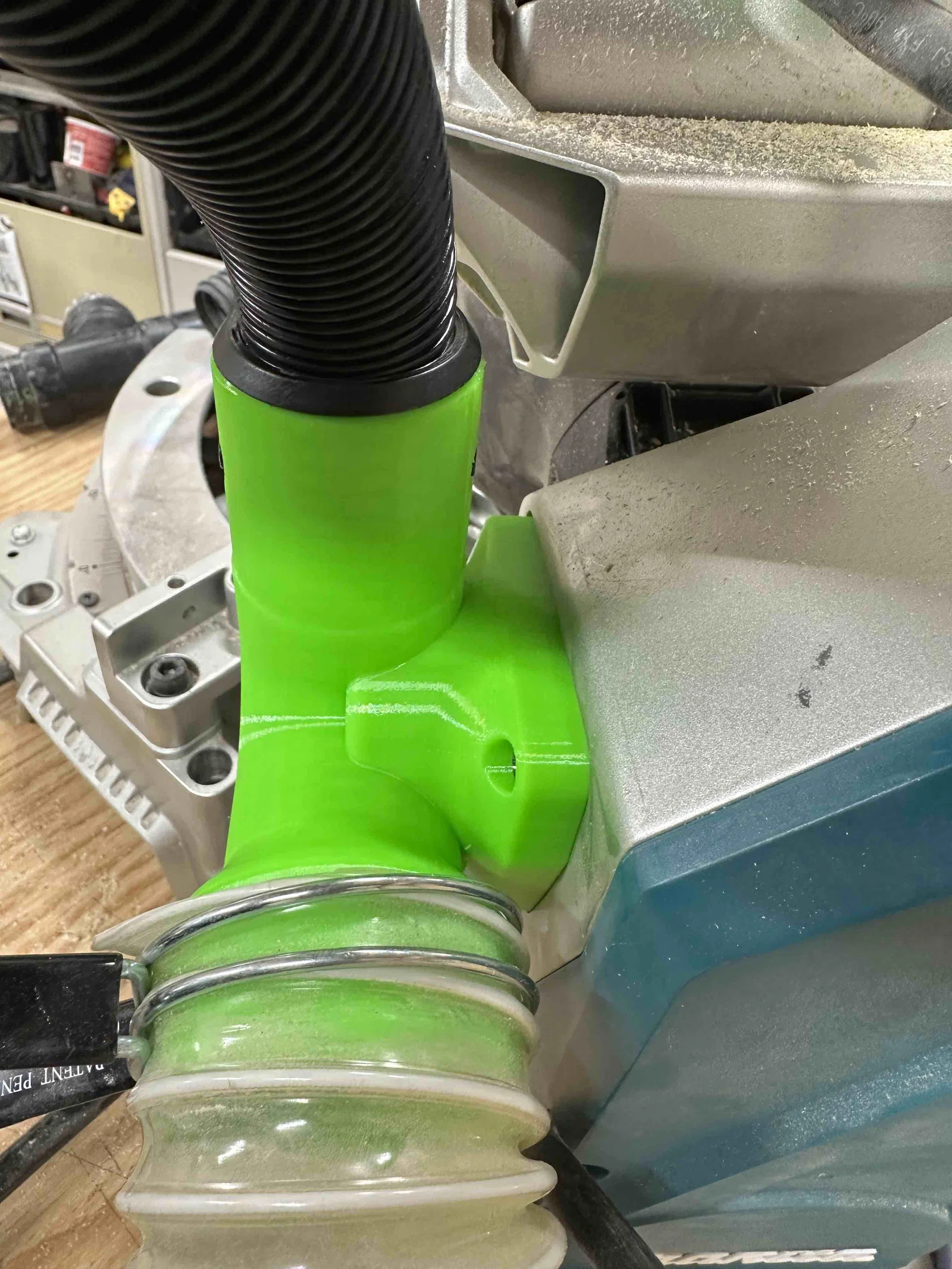 Nâng cấp đầu chuyển đổi hút bụi cho máy cưa Makita LS1219/LS1019. Thiết kế này giúp tối ưu luồng khí, tránh bị vướng khi nghiêng máy và sử dụng đầu nối 2.5 inch tiêu chuẩn cho xưởng mộc, giúp việc thu gom bụi hiệu quả và chắc chắn hơn.