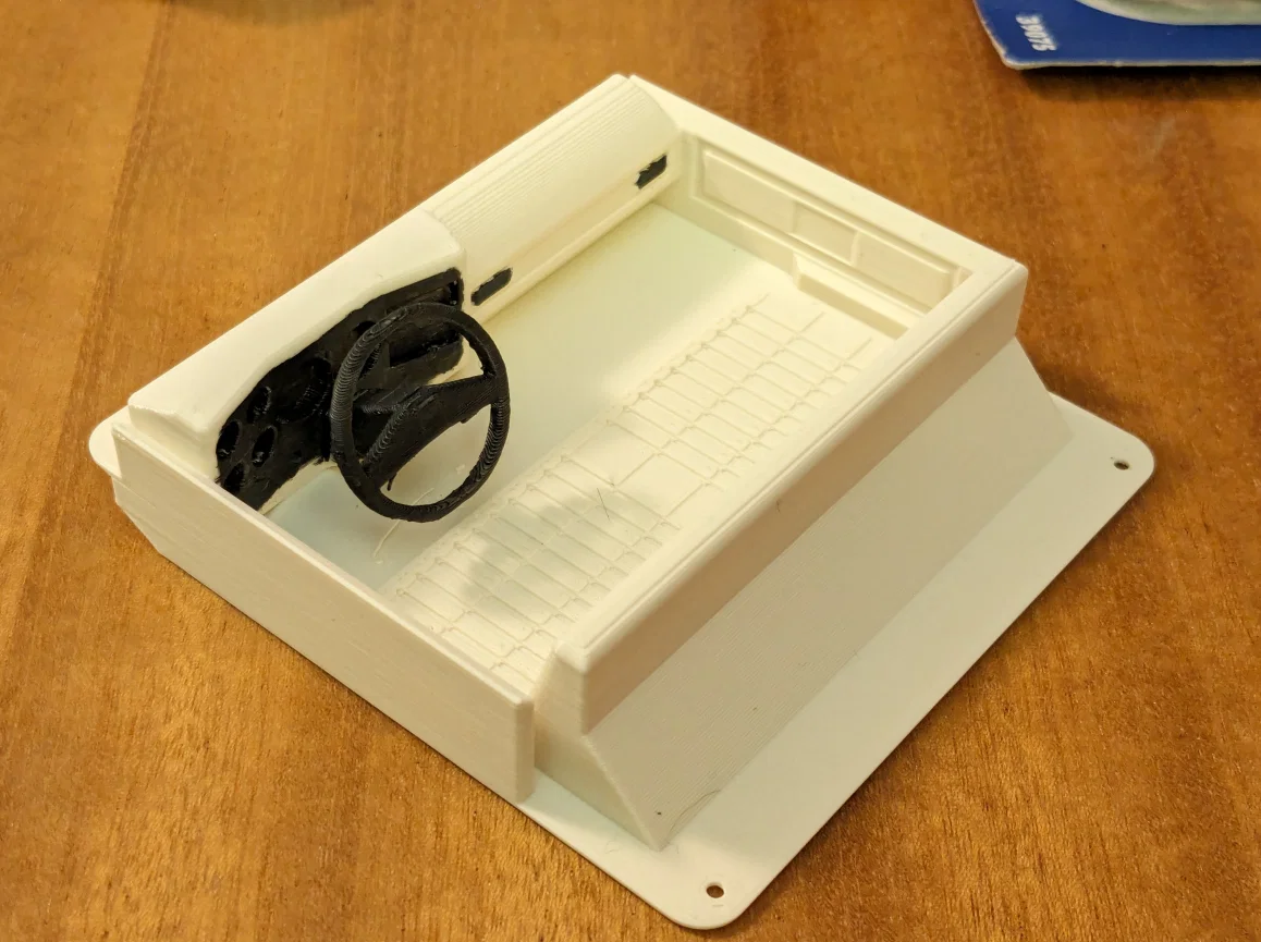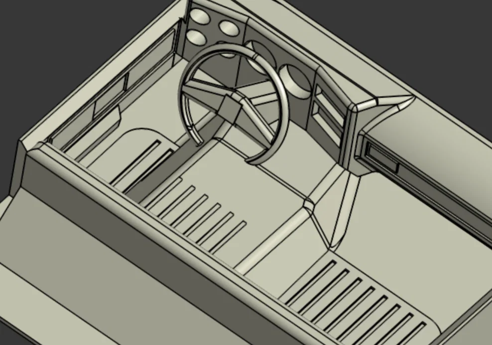 Nội thất gắn vào xe thông qua 4 con ốc có sẵn trên thân xe - 2 ốc sau giữ thanh chống lật (rollbar) và 2 ốc trước giữ kính chắn gió. Đây mới chỉ là bản nháp đầu tiên nên có thể chưa hoàn hảo, nhưng mình thiết kế để in nhanh và đơn giản, cá nhân mình thấy nó vẫn tốt hơn là để trống trơn bên trong cabin như mặc định :)