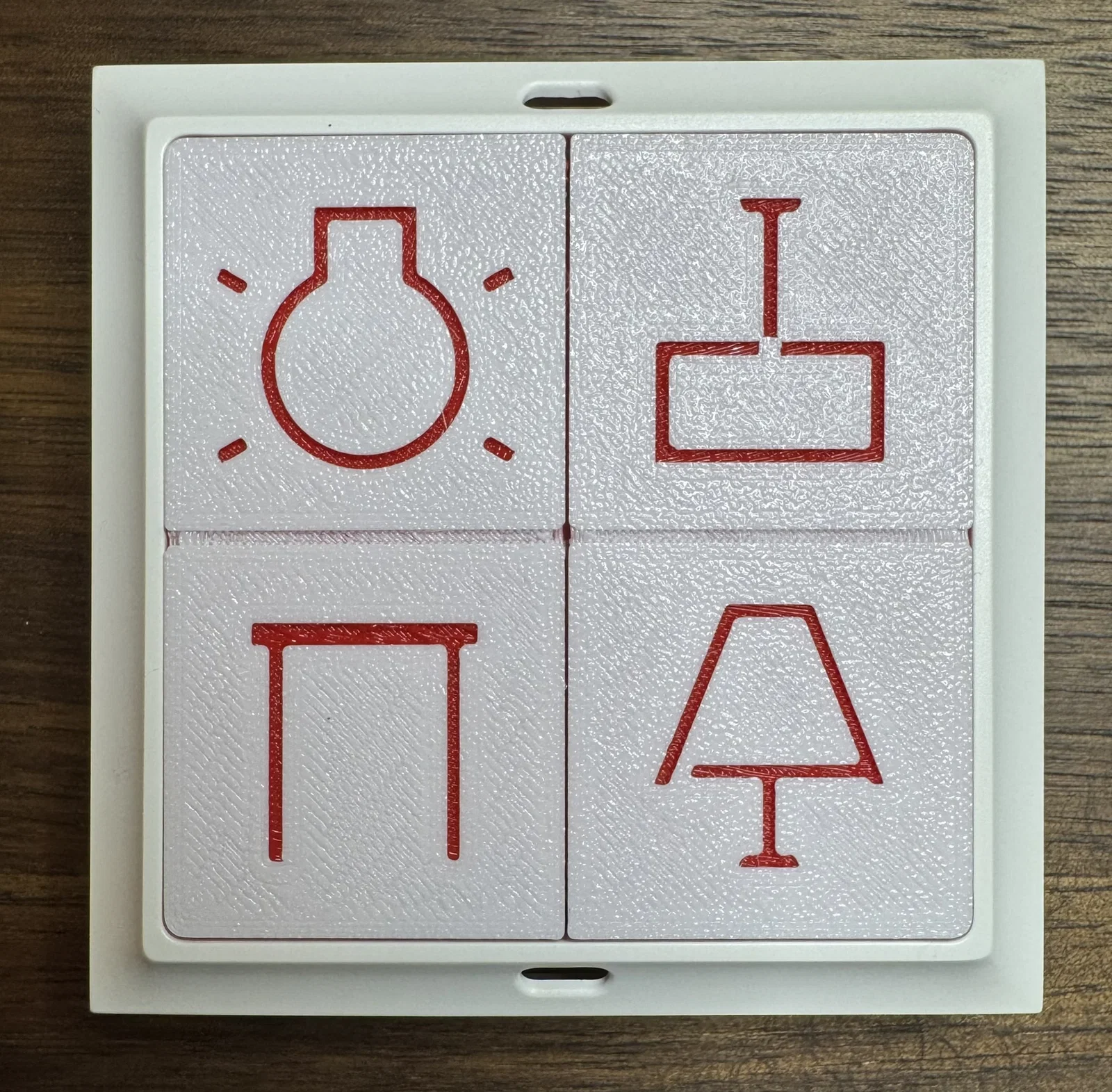 Để dễ phân biệt các nút bấm trên Shelly BLU Wall Switch 4, mình đã thiết kế một mẫu mà bạn có thể chèn bất kỳ biểu tượng nào vào mặt dưới (phần nút bấm) dưới dạng negative volume. Mình đã sử dụng các biểu tượng riêng với chiều cao 0.5 mm. Phần tay cầm của nút bấm được mình làm dày dặn hơn một chút, mặc dù đây vẫn là điểm yếu của sản phẩm. Việc lắp vào bằng cách nhấn rất mượt mà, nhưng khi tháo ra thì phần tay cầm có thể không còn giữ được chắc chắn nữa... Mình đã thêm các lỗ ở tay cầm, biểu tượng và đường chia nút bấm trong PS để bạn có thể tùy chỉnh theo ý muốn. Nút bấm này tương thích với phiên bản điều khiển không dây có hai nắp cho bốn nút. Mình đã in bằng vòi phun 0.25 với thông số 0.07 ultradetail, độ lấp đầy 100% bằng nhựa PETG.