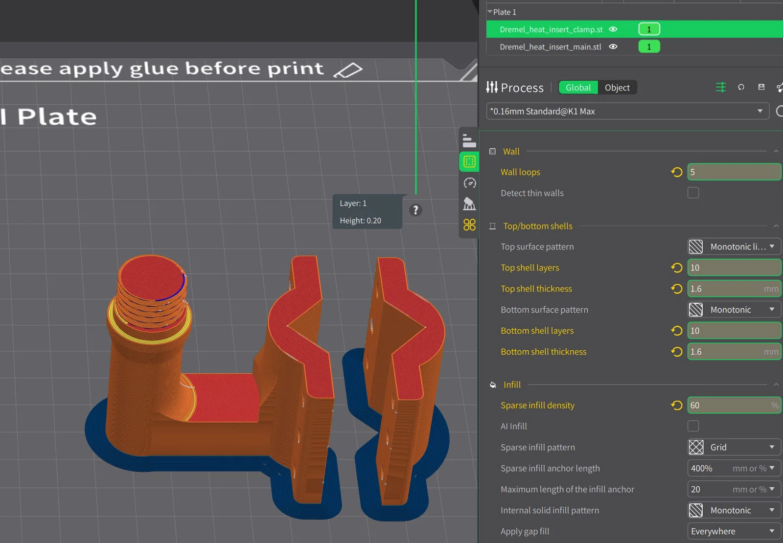 Adapter nhanh gắn mỏ hàn vào giá đỡ Dremel, dùng để ép heat insert, phù hợp cho mỏ hàn có đường kính từ 14mm trở lên. Khuyên dùng in bằng nhựa PETG với 5 lớp vỏ (outer layers) và độ lấp đầy (infill) 60% để đảm bảo độ cứng, không bị cong vênh. Chiều cao lớp in (layer height) 0.16 mm để khớp với ren. Đã in thử nghiệm trên máy Creality K1 Max. Có sẵn lỗ 4mm cho ốc và đai ốc M4, bạn hãy chọn chiều dài ốc phù hợp với độ dày của mỏ hàn. Thiết kế này giúp tháo lắp dễ dàng để bạn vẫn có thể tận dụng giá đỡ cho máy khoan Dremel như bình thường. Bạn có thể lắp ở mặt trước hoặc bên phải ngay tại phần rãnh của lớp trên cùng trên giá đỡ Dremel. Nhớ chia sẻ ảnh sản phẩm sau khi in vào mục Makes nhé!
