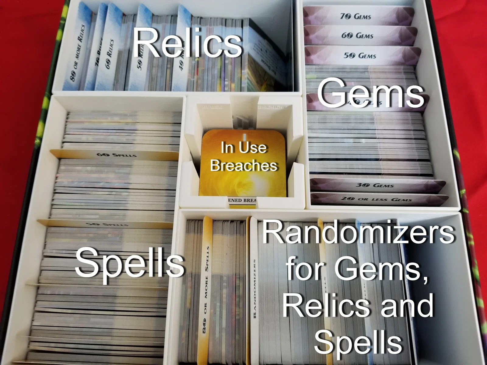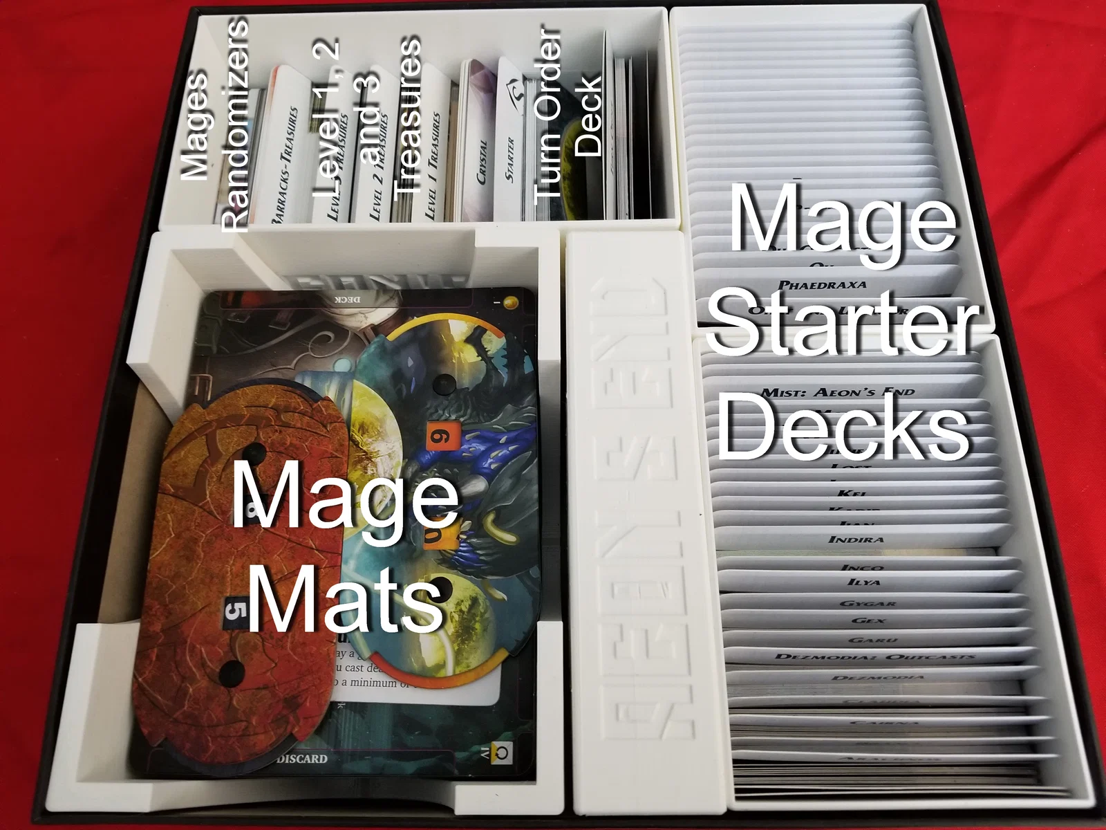 Bộ khay chứa (insert) cho hộp boardgame Aeon's End - những khay này chứa được tất cả các thành phần từ tất cả các bản mở rộng cho đến bản Outcasts Kickstarter, bao gồm cả các thành phần trong bản Legacy, mà không dùng kèm bọc bài (sleeves).