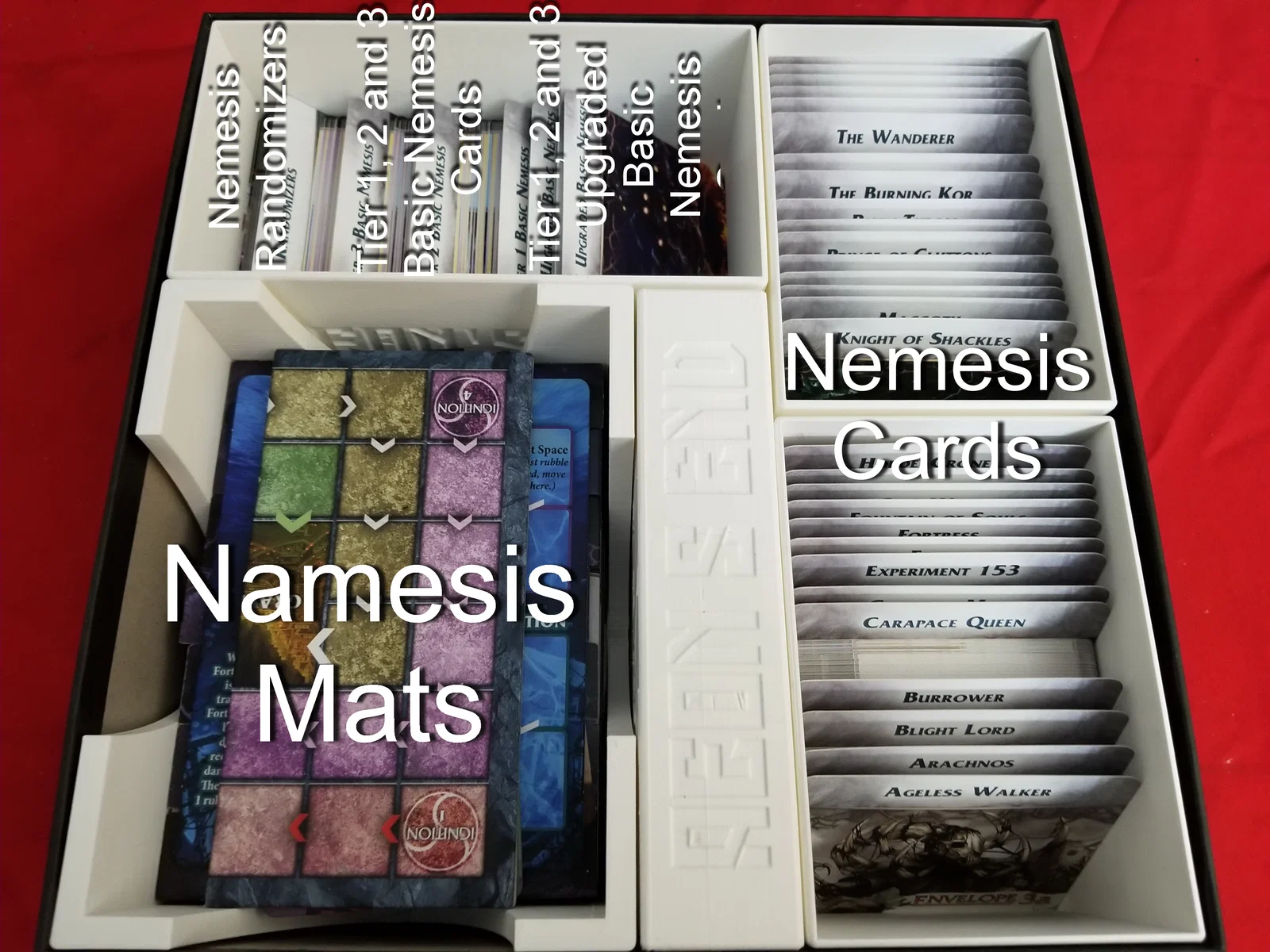 Aeon's End: War Eternal - Bộ bài Nemesis, bộ Randomizer của Nemesis, các bộ bài cơ bản Nemesis cấp 1, 2, 3, các bộ bài Nemesis nâng cấp cấp 1, 2, 3, hộp đựng token B, hộp đựng thêm token (đặt trên thảm trải Nemesis - không hiển thị trong hình ảnh hộp game)