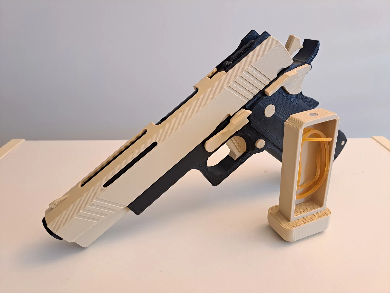 Đây là mô hình tỉ lệ 1:1 của khẩu Tokyo Marui Hi Capa 5.1. Súng có khả năng bắn 4 sợi thun với cơ chế blowback đơn giản. Bạn có thể cất giữ thêm thun dự phòng ngay trong băng đạn. Mình cũng đã thiết kế thêm lẫy khóa trượt (slide catch) và búa đập hoạt động được để tăng độ chi tiết. Súng được thiết kế với tính tùy biến cao, bạn có thể tự do phối màu theo sở thích cá nhân.