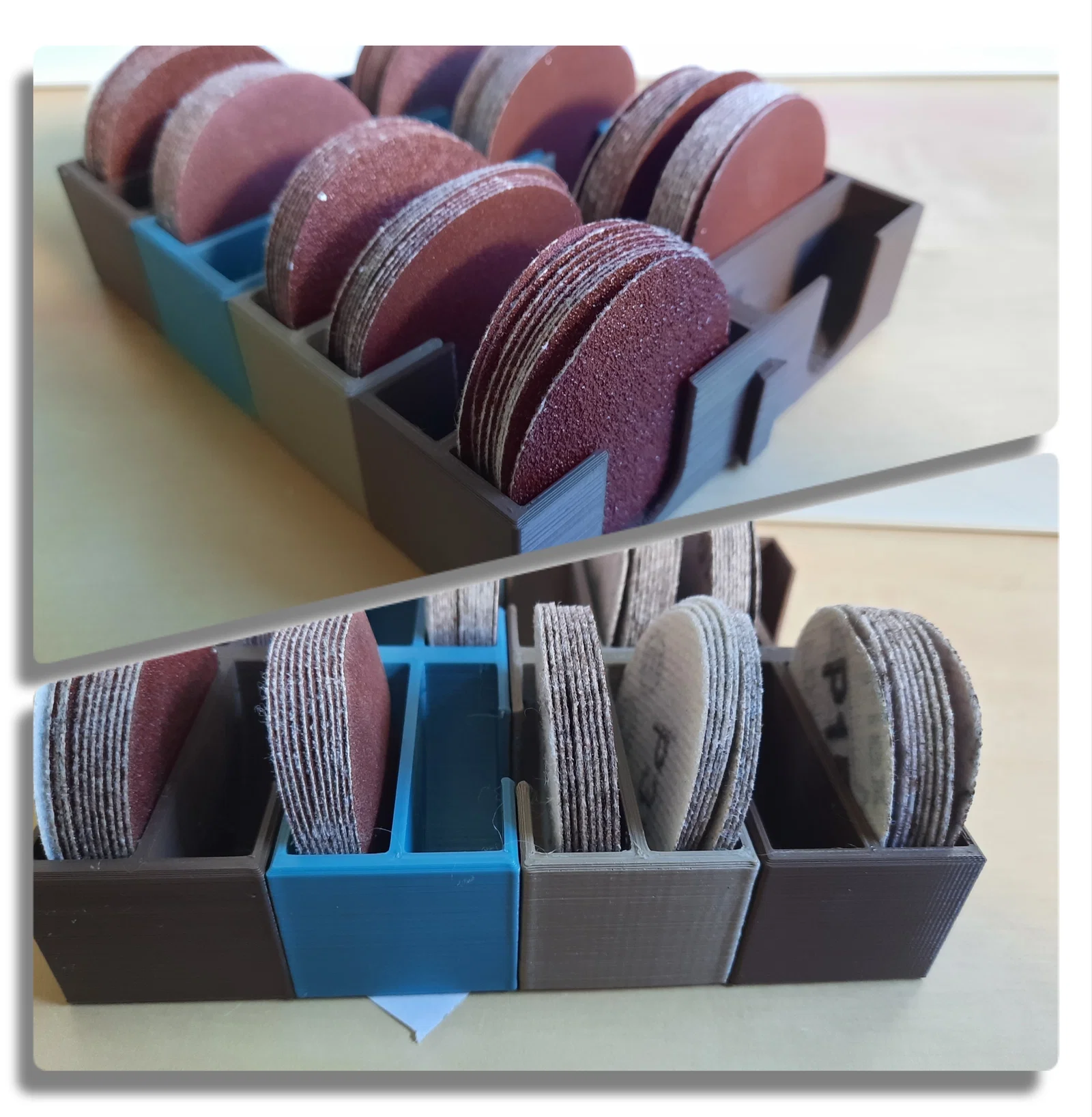 Thiết kế của mẫu này vô cùng tiện lợi nhờ khả năng lắp ghép (pluggable) linh hoạt. Bạn có thể in nhiều khay đơn lẻ rồi ghép nối chúng lại với nhau tùy theo số lượng các loại nhám mà bạn đang sở hữu. Với đường kính phù hợp hoàn hảo cho các loại đĩa nhám 50mm thông dụng, sản phẩm này giúp giữ cho giấy nhám luôn phẳng, không bị cong vênh và dễ dàng lấy ra sử dụng ngay lập tức mà không cần tốn công lục lọi.