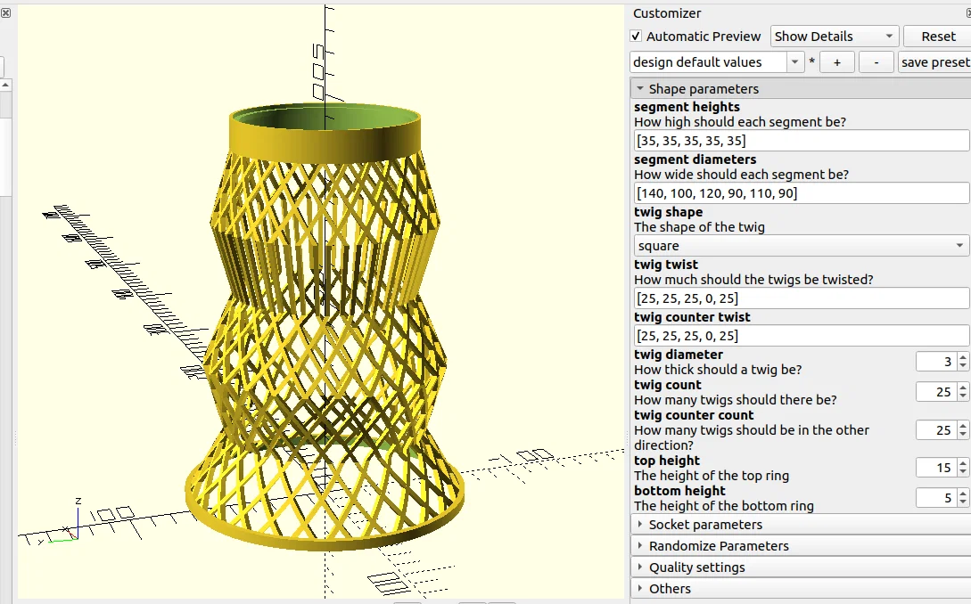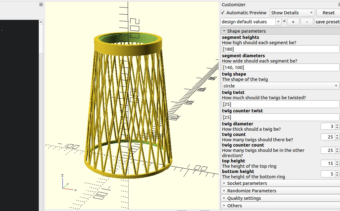Mô hình này thực chất là một đoạn script OpenSCAD cực kỳ mạnh mẽ, cho phép bạn tự tạo ra những chiếc chụp đèn độc nhất vô nhị. Bạn có thể thoải mái điều chỉnh các thông số để tùy biến thiết kế và vẻ ngoài của chụp đèn theo ý thích.